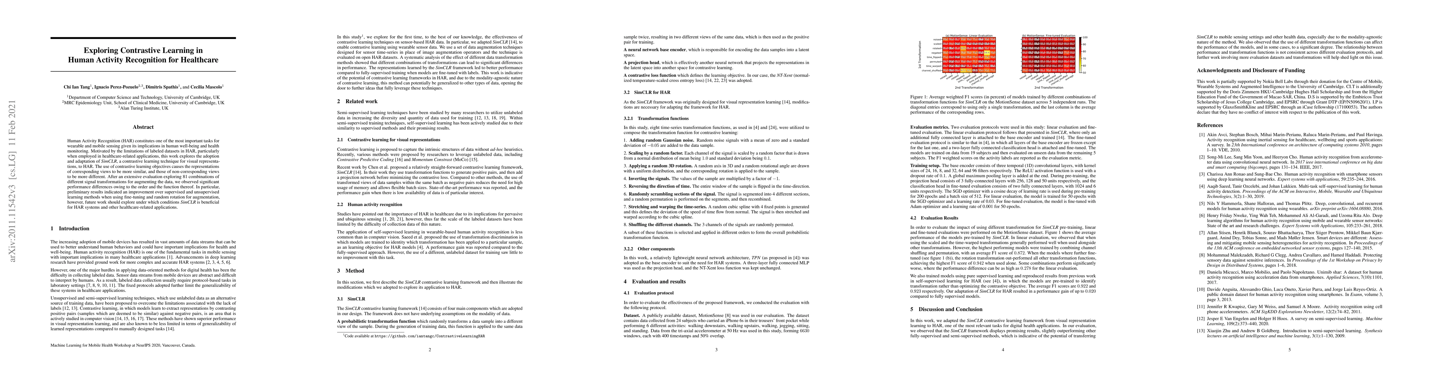Human Activity Recognition (HAR) constitutes one of the most important tasks for wearable and mobile sensing given its implications in human well-being and health monitoring. Motivated by the limitations of labeled datasets in HAR, particularly when employed in healthcare-related applications, this work explores the adoption and adaptation of SimCLR, a contrastive learning technique for visual representations, to HAR. The use of contrastive learning objectives causes the representations of corresponding views to be more similar, and those of non-corresponding views to be more different. After an extensive evaluation exploring 64 combinations of different signal transformations for augmenting the data, we observed significant performance differences owing to the order and the function thereof. In particular, preliminary results indicated an improvement over supervised and unsupervised learning methods when using fine-tuning and random rotation for augmentation, however, future work should explore under which conditions SimCLR is beneficial for HAR systems and other healthcare-related applications.