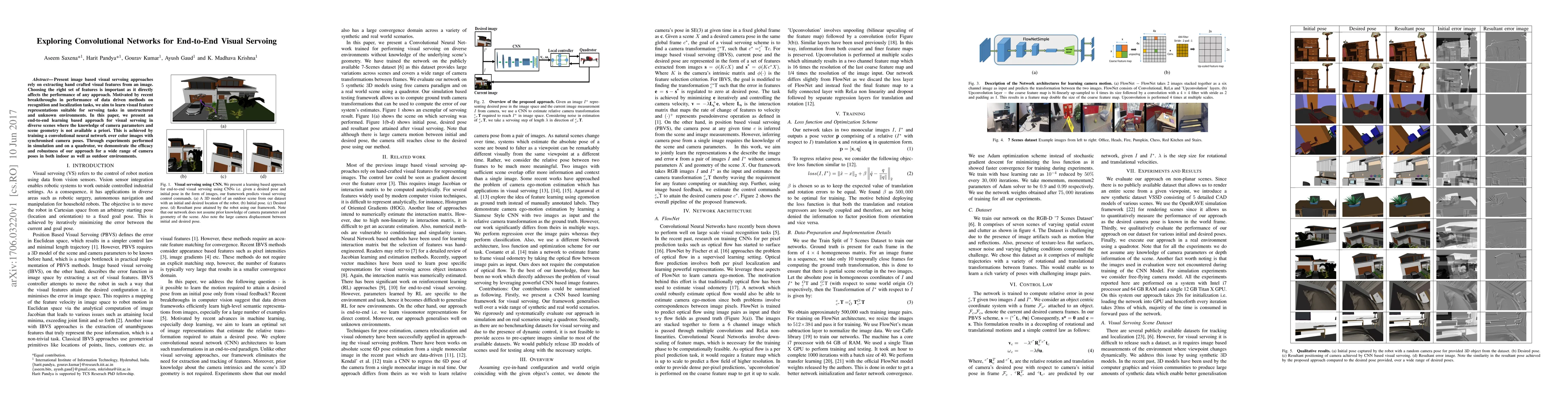 This paper proposes an end-to-end learning method using convolutional neural networks for visual servoing in unknown environments, eliminating the need for hand-crafted features and prior knowledge of camera parameters. Experiments show the method's effectiveness across various camera poses in both indoor and outdoor settings.