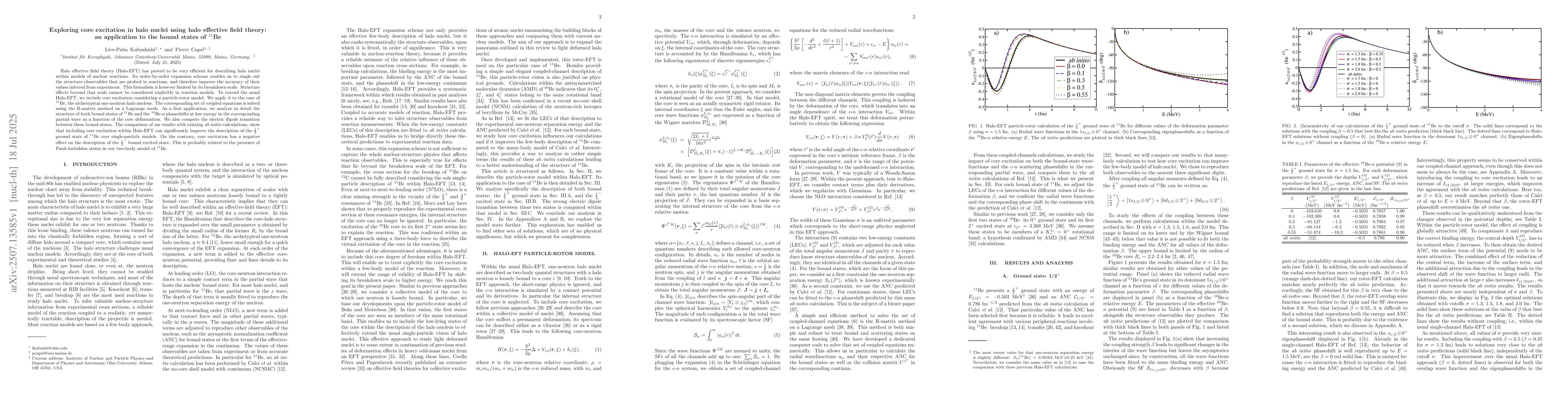 Halo effective field theory (Halo-EFT) has proved to be very efficient for describing halo nuclei within models of nuclear reactions. Its order-by-order expansion scheme enables us to single out the structure observables that are probed in reactions, and therefore improve the accuracy of their values inferred from experiment. This formalism is however limited by its breakdown scale. Structure effects beyond that scale cannot be considered explicitly in reaction models. To extend the usual Halo-EFT, we include core excitation considering a particle-rotor model. We apply it to the case of $^{11}$Be, the archetypical one-neutron halo nucleus. The corresponding set of coupled equations is solved using the R-matrix method on a Lagrange mesh. As a first application, we analyze in detail the structure of both bound states of $^{11}$Be and the $^{10}$Be-n phaseshifts at low energy in the corresponding partial wave as a function of the core deformation. We also compute the electric dipole transition between these bound states. The comparison of our results with existing \textit{ab initio} calculations, show that including core excitation within Halo-EFT can significantly improve the description of the $\frac{1}{2}^+$ ground state of $^{11}$Be over single-particle models. On the contrary, core excitation has a negative effect on the description of the $\frac{1}{2}^-$ bound excited state. This is probably related to the presence of Pauli-forbidden states in our two-body model of $^{11}$Be.