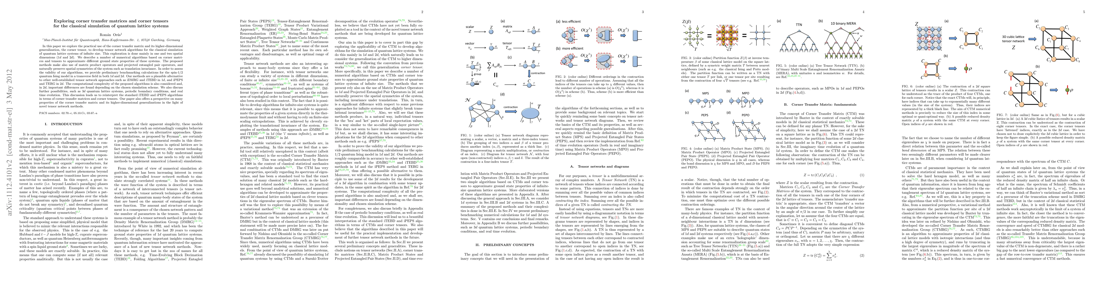 This paper investigates the application of corner transfer matrices and corner tensors to develop tensor network algorithms for simulating quantum lattice systems of infinite size, focusing on 1d and 2d systems. The proposed methods offer alternatives to established tensor network approaches and show promising computational complexity, with particular insights into 2d simulations and potential extensions to 3d systems.