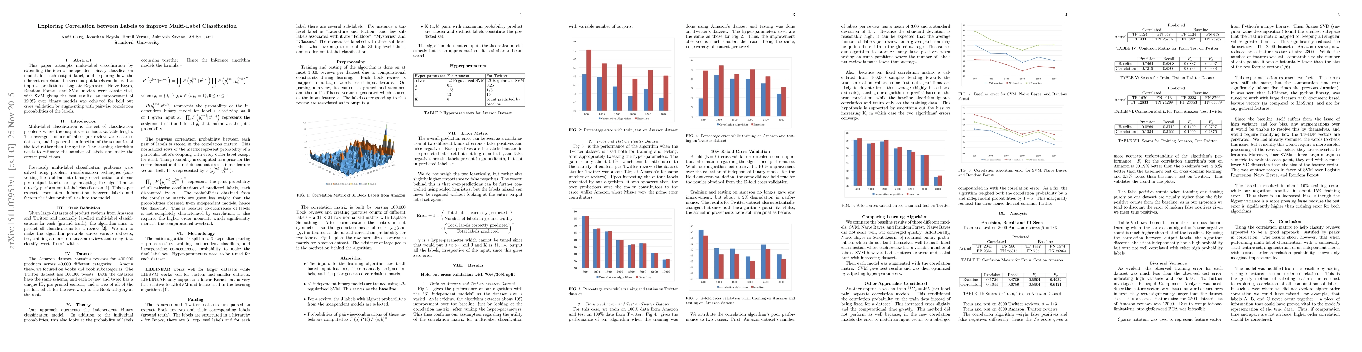 This paper investigates multi-label classification by leveraging label correlations to enhance prediction accuracy, achieving a 12.9% improvement over independent binary models using SVM augmented with pairwise label correlation probabilities.