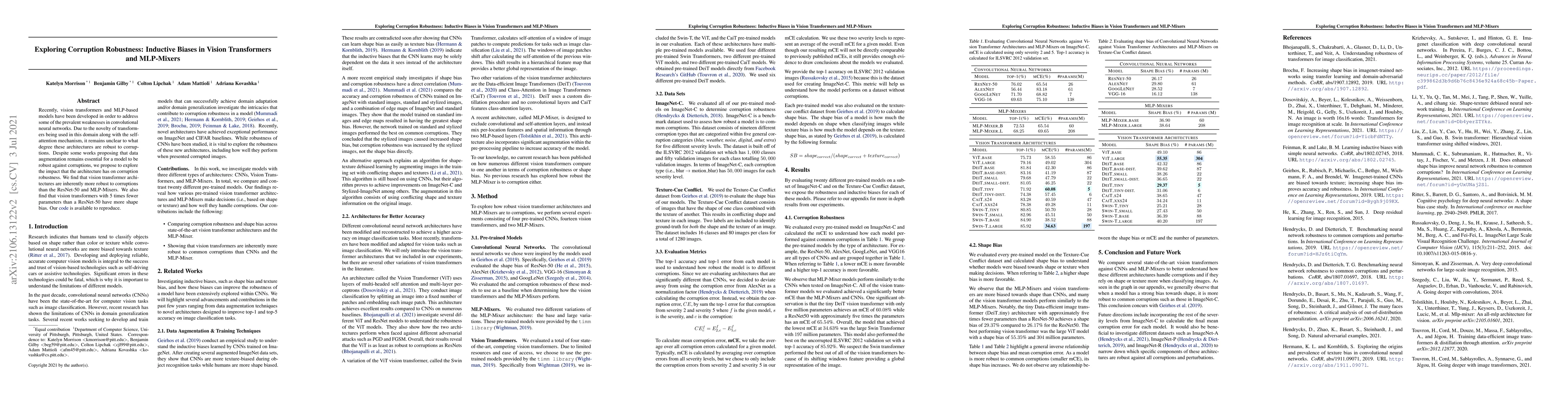 Recently, vision transformers and MLP-based models have been developed in order to address some of the prevalent weaknesses in convolutional neural networks. Due to the novelty of transformers being used in this domain along with the self-attention mechanism, it remains unclear to what degree these architectures are robust to corruptions. Despite some works proposing that data augmentation remains essential for a model to be robust against corruptions, we propose to explore the impact that the architecture has on corruption robustness. We find that vision transformer architectures are inherently more robust to corruptions than the ResNet-50 and MLP-Mixers. We also find that vision transformers with 5 times fewer parameters than a ResNet-50 have more shape bias. Our code is available to reproduce.