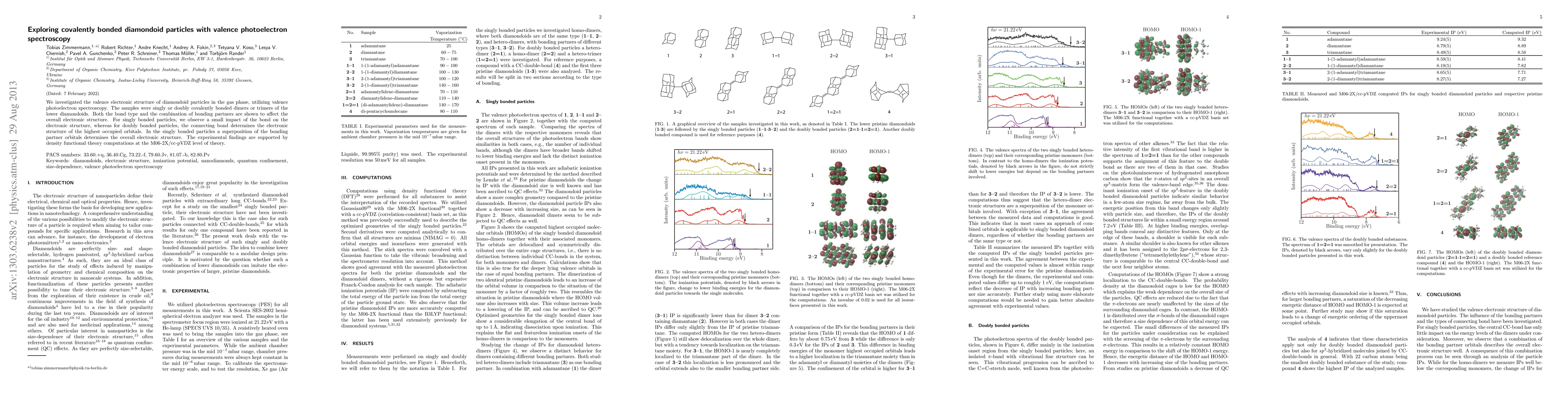 We investigated the valence electronic structure of diamondoid particles in the gas phase, utilizing valence photoelectron spectroscopy. The samples were singly or doubly covalently bonded dimers or trimers of the lower diamondoids. Both the bond type and the combination of bonding partners are shown to affect the overall electronic structure. For singly bonded particles, we observe a small impact of the bond on the electronic structure, whereas for doubly bonded particles, the connecting bond determines the electronic structure of the highest occupied orbitals. In the singly bonded particles a superposition of the bonding partner orbitals determines the overall electronic structure. The experimental findings are supported by density functional theory computations at the M06-2X/cc-pVDZ level of theory.