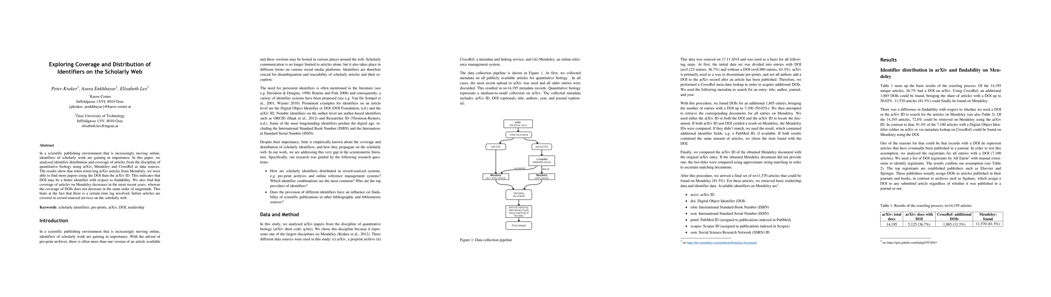In a scientific publishing environment that is increasingly moving online, identifiers of scholarly work are gaining in importance. In this paper, we analysed identifier distribution and coverage of articles from the discipline of quantitative biology using arXiv, Mendeley and CrossRef as data sources. The results show that when retrieving arXiv articles from Mendeley, we were able to find more papers using the DOI than the arXiv ID. This indicates that DOI may be a better identifier with respect to findability. We also find that coverage of articles on Mendeley decreases in the most recent years, whereas the coverage of DOIs does not decrease in the same order of magnitude. This hints at the fact that there is a certain time lag involved, before articles are covered in crowd-sourced services on the scholarly web.