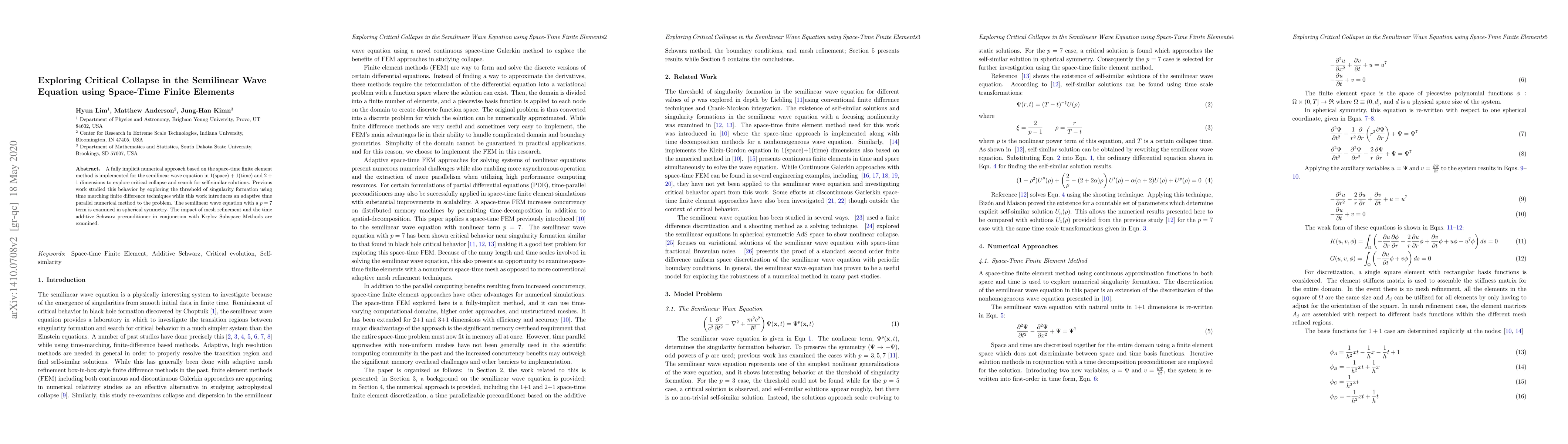 This paper employs a space-time finite element method to numerically investigate critical collapse in the semilinear wave equation, focusing on self-similar solutions in 1+1 and 2+1 dimensions. It introduces an adaptive time parallel numerical method, examining the equation's behavior with mesh refinement and employing a time additive Schwarz preconditioner with Krylov Subspace Methods.