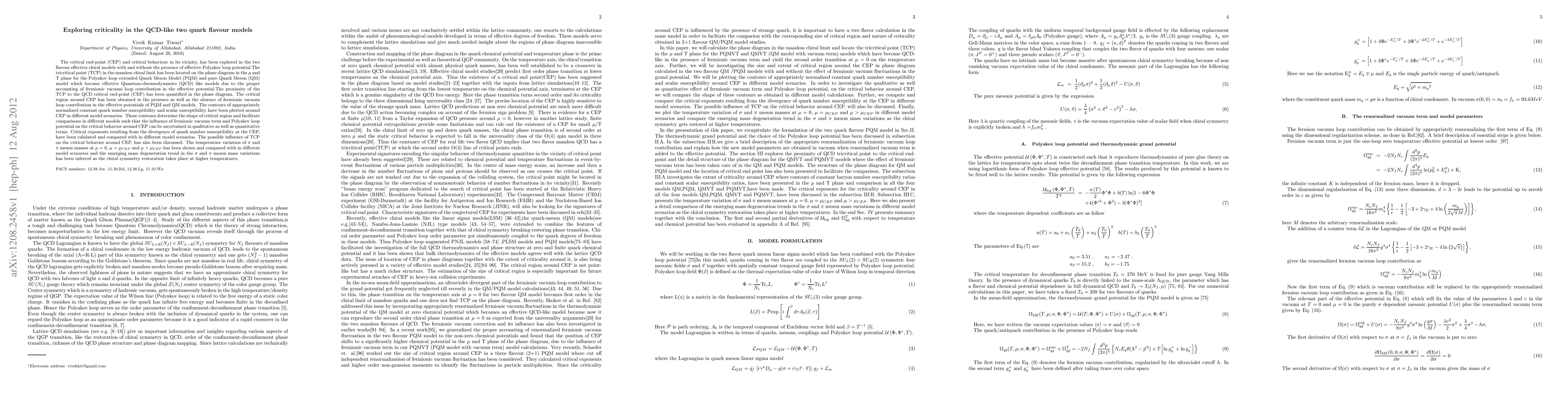 This paper explores critical behavior near the critical end-point (CEP) in two-flavor QCD-like models, specifically the Polyakov loop extended Quark Meson Model (PQM) and the pure Quark Meson (QM) model. It locates the tricritical point (TCP) in the phase diagram and analyzes the influence of fermionic vacuum loops and Polyakov loop potentials on critical behavior, comparing critical exponents and meson mass variations.