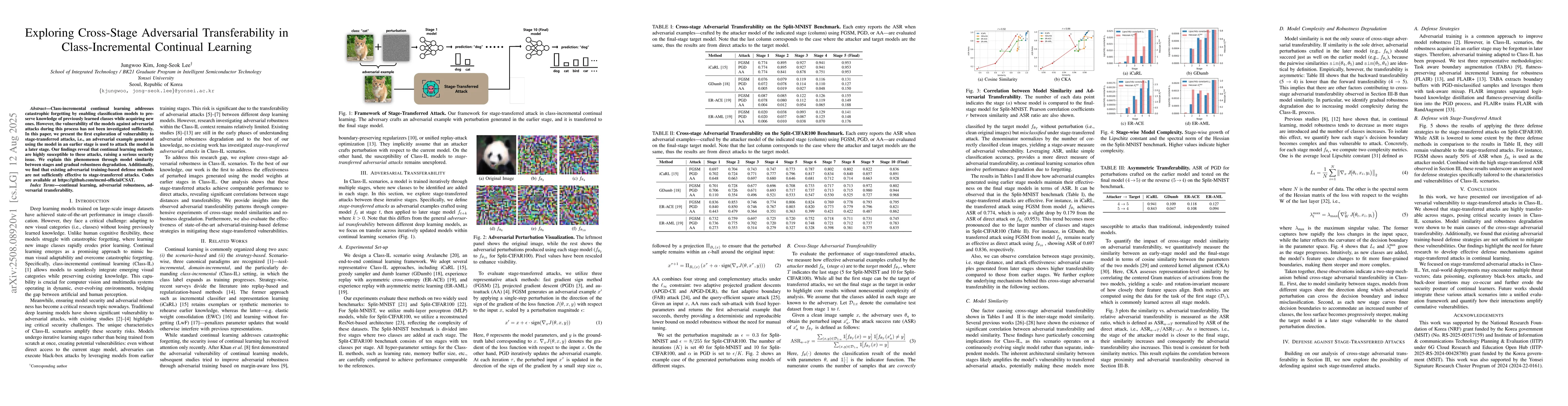 Class-incremental continual learning addresses catastrophic forgetting by enabling classification models to preserve knowledge of previously learned classes while acquiring new ones. However, the vulnerability of the models against adversarial attacks during this process has not been investigated sufficiently. In this paper, we present the first exploration of vulnerability to stage-transferred attacks, i.e., an adversarial example generated using the model in an earlier stage is used to attack the model in a later stage. Our findings reveal that continual learning methods are highly susceptible to these attacks, raising a serious security issue. We explain this phenomenon through model similarity between stages and gradual robustness degradation. Additionally, we find that existing adversarial training-based defense methods are not sufficiently effective to stage-transferred attacks. Codes are available at https://github.com/mcml-official/CSAT.