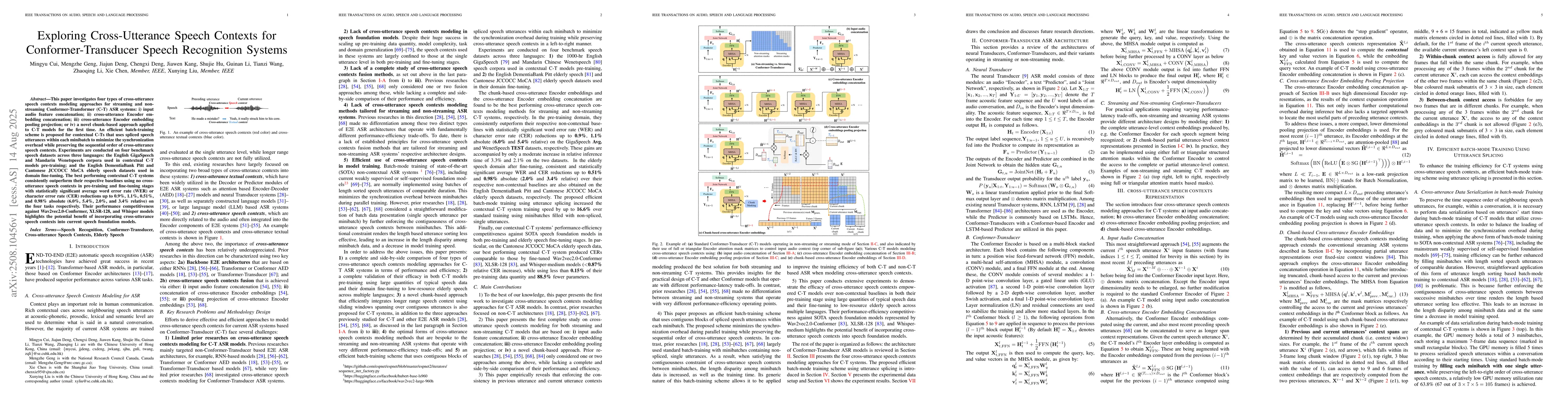 This paper investigates four types of cross-utterance speech contexts modeling approaches for streaming and non-streaming Conformer-Transformer (C-T) ASR systems: i) input audio feature concatenation; ii) cross-utterance Encoder embedding concatenation; iii) cross-utterance Encoder embedding pooling projection; or iv) a novel chunk-based approach applied to C-T models for the first time. An efficient batch-training scheme is proposed for contextual C-Ts that uses spliced speech utterances within each minibatch to minimize the synchronization overhead while preserving the sequential order of cross-utterance speech contexts. Experiments are conducted on four benchmark speech datasets across three languages: the English GigaSpeech and Mandarin Wenetspeech corpora used in contextual C-T models pre-training; and the English DementiaBank Pitt and Cantonese JCCOCC MoCA elderly speech datasets used in domain fine-tuning. The best performing contextual C-T systems consistently outperform their respective baselines using no cross-utterance speech contexts in pre-training and fine-tuning stages with statistically significant average word error rate (WER) or character error rate (CER) reductions up to 0.9%, 1.1%, 0.51%, and 0.98% absolute (6.0%, 5.4%, 2.0%, and 3.4% relative) on the four tasks respectively. Their performance competitiveness against Wav2vec2.0-Conformer, XLSR-128, and Whisper models highlights the potential benefit of incorporating cross-utterance speech contexts into current speech foundation models.