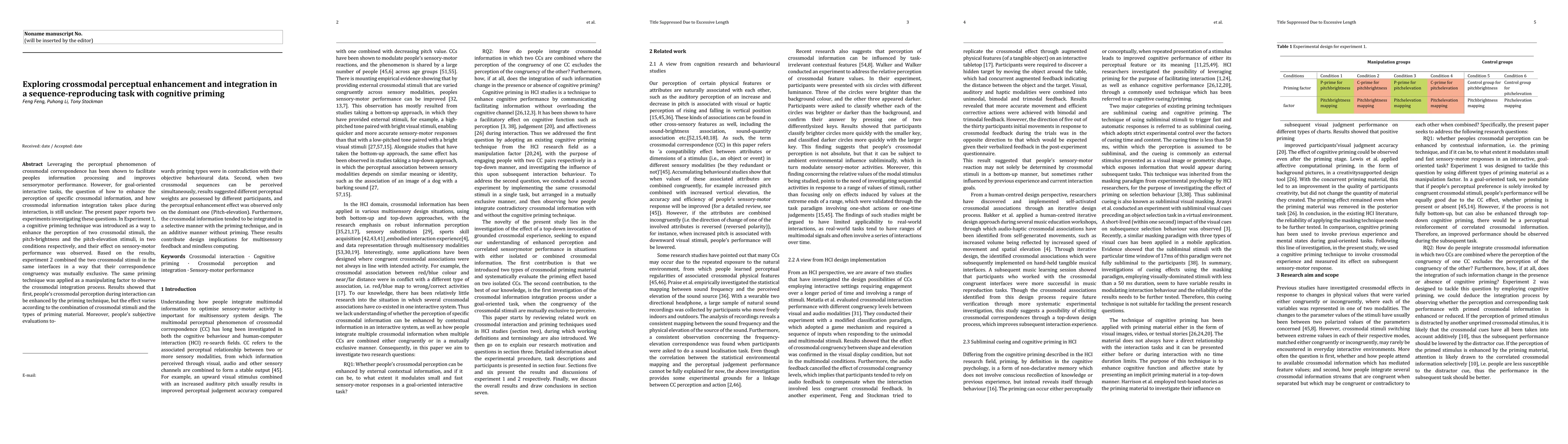 Leveraging the perceptual phenomenon of crossmoal correspondence has been shown to facilitate peoples information processing and improves sensorimotor performance. However for goal-oriented interactive tasks, the question of how to enhance the perception of specific Crossmodal information, and how Crossmodal information integration takes place during interaction is still unclear. The present paper reports two experiments investigating these questions. In the first experiment, a cognitive priming technique was introduced as a way to enhance the perception of two Crossmodal stimuli, in two conditions respectively, and their effect on sensory-motor performance was observed. Based on the results, the second experiment combined the two Crossmodal stimuli in the same interfaces in a way that their correspondence congruency was mutually exclusive. The same priming techniques was applied as a manipulating factor to observe the Crossmodal integration process. Results showed that first, the Crossmodal integration during interaction can be enhanced by the priming technique, but the effect varies according to the combination of Crossmodal stimuli and the types of priming material. Moreover, peoples subjective evaluations towards priming types were in contradiction with their objective behavioural data. Second, when two Crossmodal sequences can be perceived simultaneously, results suggested different perceptual weights are possessed by different participants, and the perceptual enhancement effect was observed only on the dominant one, the pitch-elevation. Furthermore, the Crossmodal integration tended to be integrated in a selective manner without priming. These results contribute design implications for multisensory feedback and mindless computing.