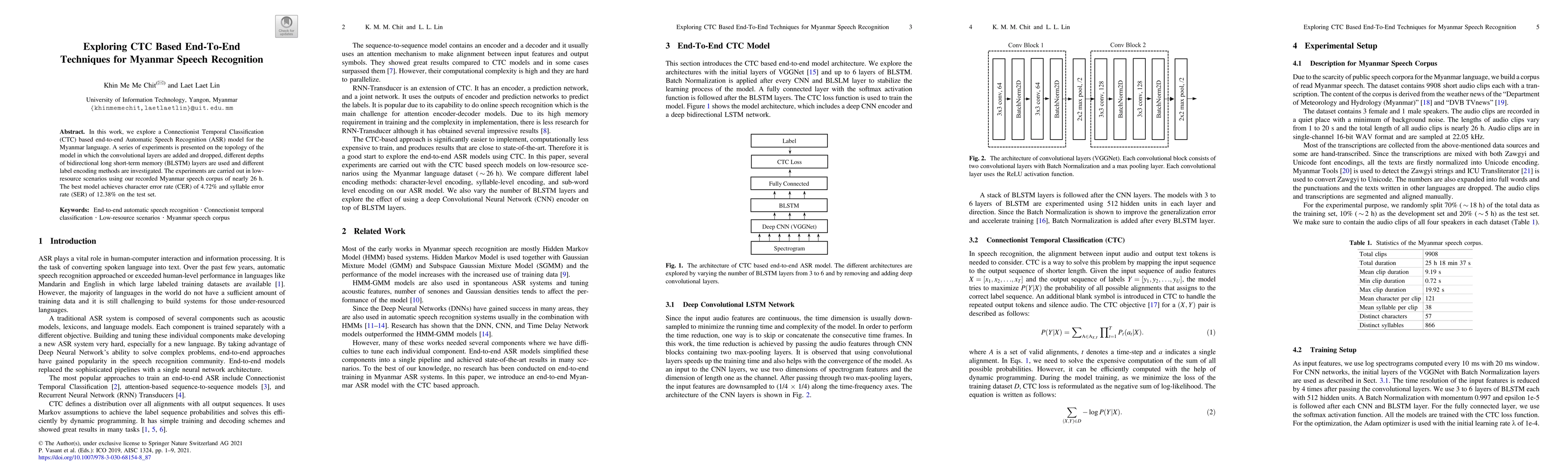 This paper investigates CTC-based end-to-end ASR models for Myanmar speech recognition, experimenting with convolutional layers, BLSTM depths, and label encodings in low-resource settings. The best model achieves a CER of 4.72% and SER of 12.38% using a 26-hour Myanmar speech corpus.
