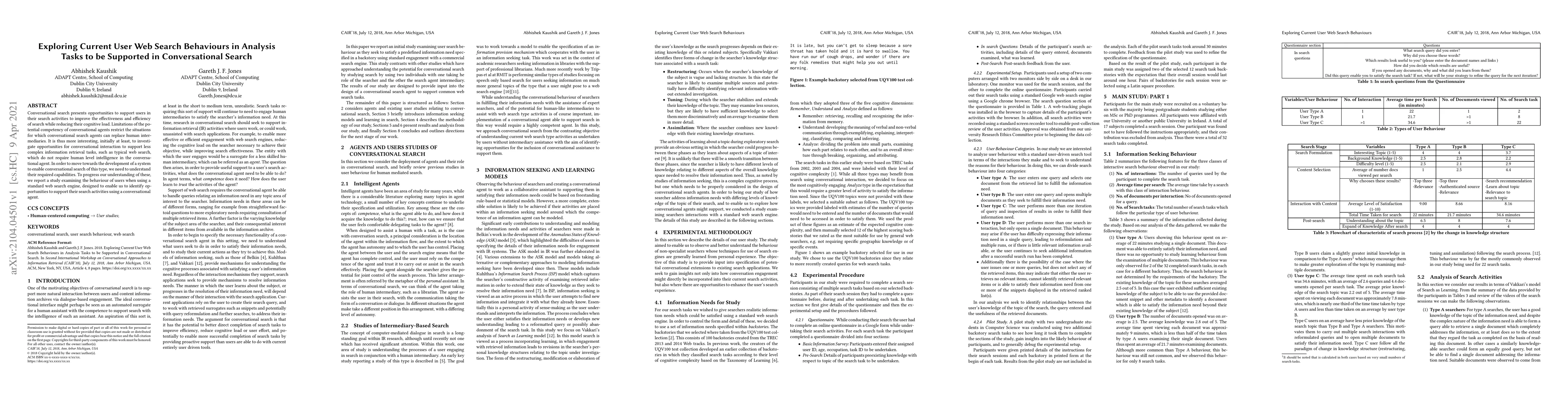 This study investigates user web search behaviours to identify how conversational search can support less complex information retrieval tasks, aiming to develop a system that enhances search efficiency and reduces cognitive load without requiring human-level intelligence from the agent. The research focuses on understanding current user behaviours to pinpoint areas where conversational agents can effectively assist in typical web search activities.