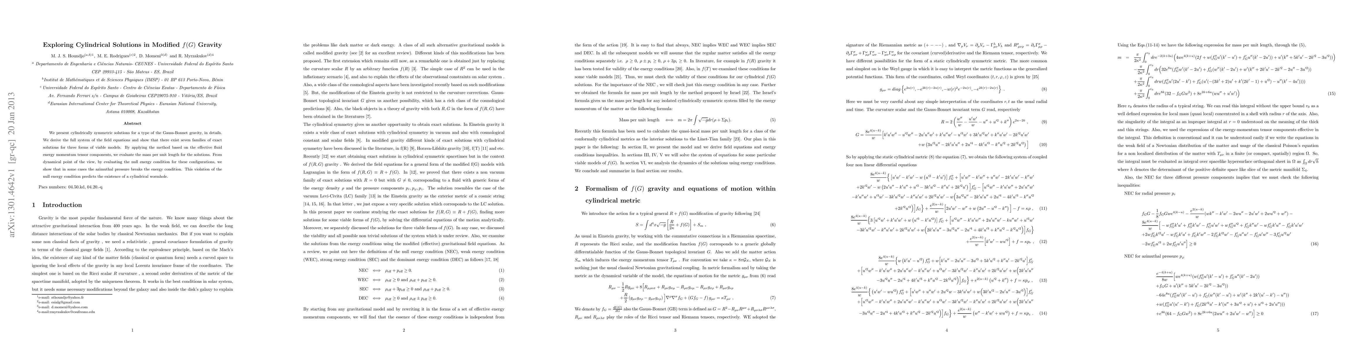We present cylindrically symmetric solutions for a type of the Gauss-Bonnet gravity, in details. We derive the full system of the field equations and show that there exist seven families of exact solutions for three forms of viable models. By applying the method based on the effective fluid energy momentum tensor components, we evaluate the mass per unit length for the solutions. From dynamical point of the view, by evaluating the null energy condition for these configurations, we show that in some cases the azimuthal pressure breaks the energy condition. This violation of the null energy condition predicts the existence of a cylindrical wormhole.
