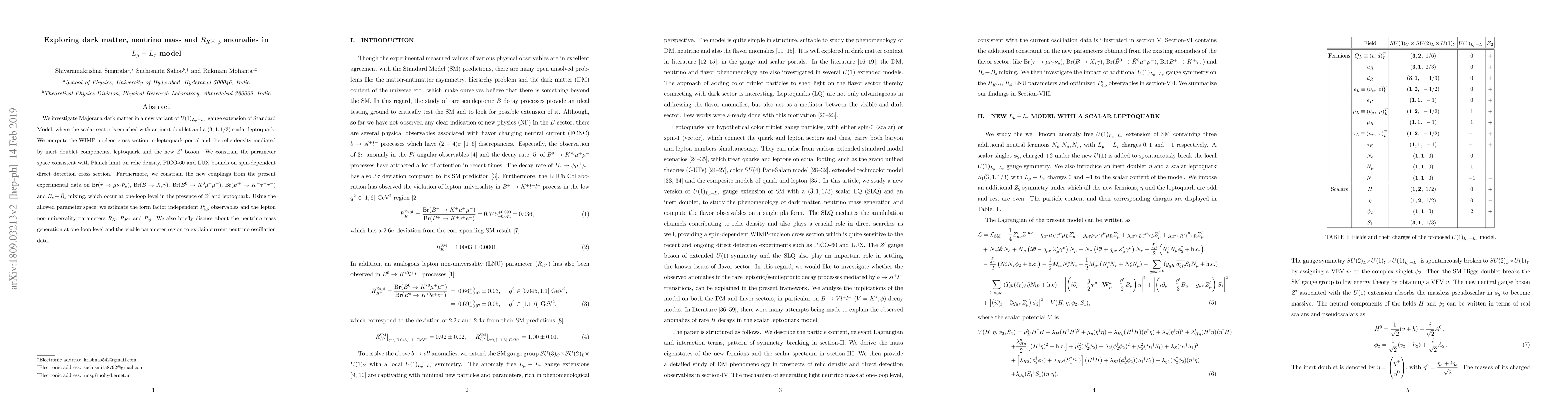 We investigate Majorana dark matter in a new variant of $U(1)_{L_{\mu}-L_{\tau}}$ gauge extension of Standard Model, where the scalar sector is enriched with an inert doublet and a $(\bar{3},1,1/3)$ scalar leptoquark. We compute the WIMP-nucleon cross section in leptoquark portal and the relic density mediated by inert doublet components, leptoquark and the new $Z^{\prime}$ boson. We constrain the parameter space consistent with Planck limit on relic density, PICO-60 and LUX bounds on spin-dependent direct detection cross section. Furthermore, we constrain the new couplings from the present experimental data on ${\rm Br}(\tau \to \mu \nu_\tau \bar \nu_\mu)$, ${\rm Br}( B \to X_s \gamma)$, ${\rm Br}( B^0 \to K^0 \mu^+ \mu^-)$, ${\rm Br}(B^+ \to K^+ \tau^+ \tau^-)$ and $B_s-\bar{B_s}$ mixing, which occur at one-loop level in the presence of $Z^\prime$ and leptoquark. Using the allowed parameter space, we estimate the form factor independent $P_{4,5}^\prime$ observables and the lepton non-universality parameters $R_{K}$, $R_{K^*}$ and $R_\phi$. We also briefly discuss about the neutrino mass generation at one-loop level and the viable parameter region to explain current neutrino oscillation data.