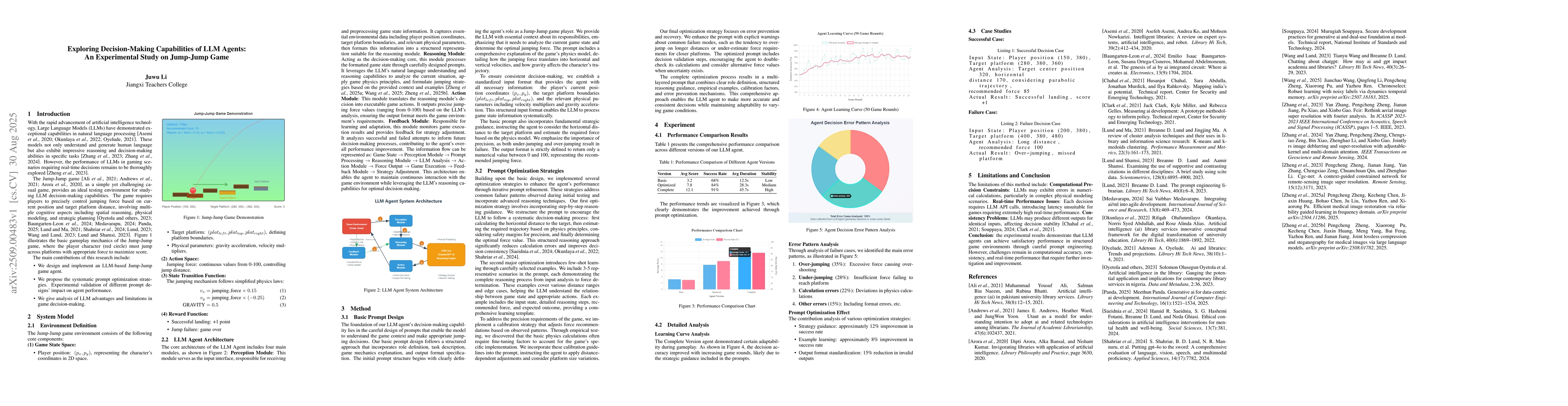 The Jump-Jump game, as a simple yet challenging casual game, provides an ideal testing environment for studying LLM decision-making capabilities. The game requires players to precisely control jumping force based on current position and target platform distance, involving multiple cognitive aspects including spatial reasoning, physical modeling, and strategic planning. It illustrates the basic gameplay mechanics of the Jump-Jump game, where the player character (red circle) must jump across platforms with appropriate force to maximize score.
