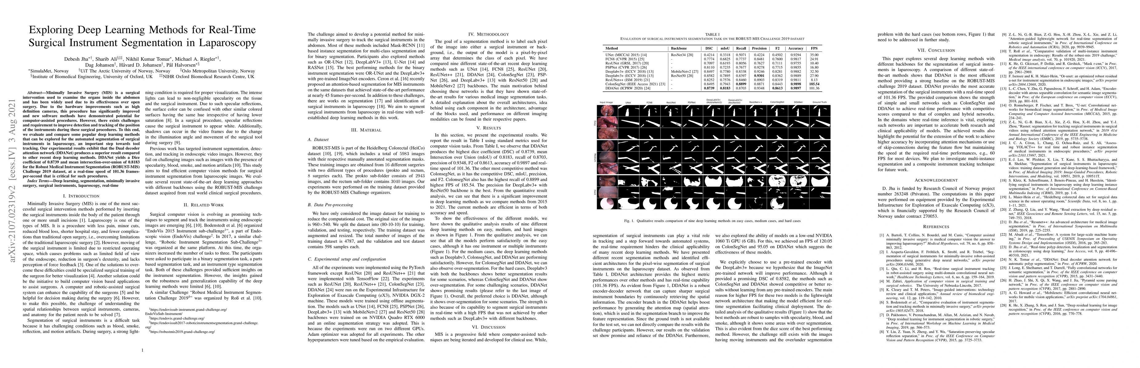 This paper explores deep learning methods for real-time segmentation of surgical instruments in laparoscopy, comparing popular techniques to enhance instrument detection and tracking. The Dual decoder attention network (DDANet) outperforms others, achieving a Dice coefficient of 0.8739 and a mean intersection-over-union of 0.8183 at 101.36 frames per second, crucial for real-time surgical assistance.
