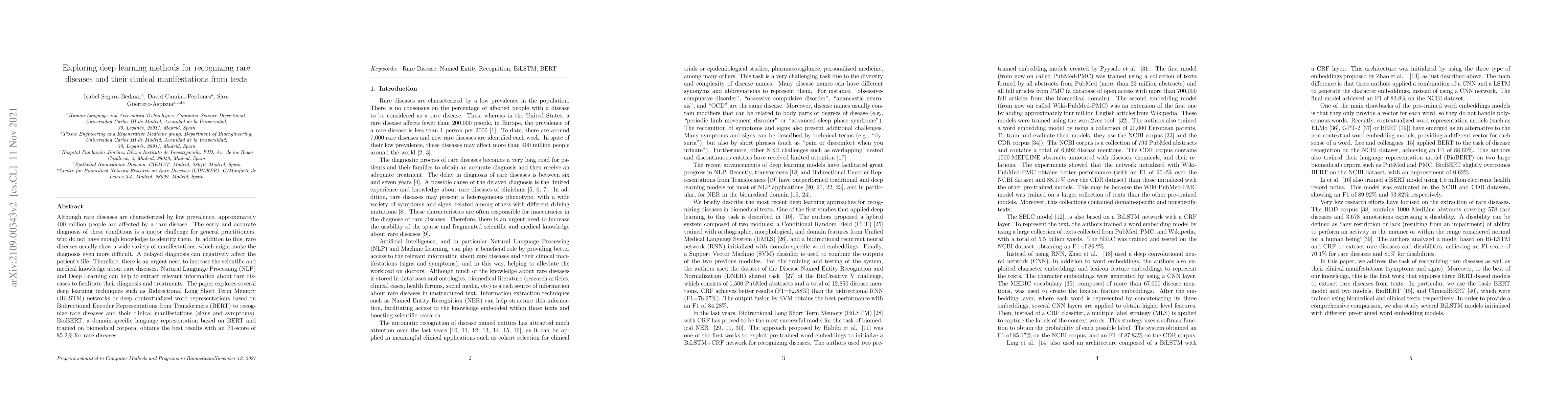 Although rare diseases are characterized by low prevalence, approximately 300 million people are affected by a rare disease. The early and accurate diagnosis of these conditions is a major challenge for general practitioners, who do not have enough knowledge to identify them. In addition to this, rare diseases usually show a wide variety of manifestations, which might make the diagnosis even more difficult. A delayed diagnosis can negatively affect the patient's life. Therefore, there is an urgent need to increase the scientific and medical knowledge about rare diseases. Natural Language Processing (NLP) and Deep Learning can help to extract relevant information about rare diseases to facilitate their diagnosis and treatments. The paper explores the use of several deep learning techniques such as Bidirectional Long Short Term Memory (BiLSTM) networks or deep contextualized word representations based on Bidirectional Encoder Representations from Transformers (BERT) to recognize rare diseases and their clinical manifestations (signs and symptoms) in the RareDis corpus. This corpus contains more than 5,000 rare diseases and almost 6,000 clinical manifestations. BioBERT, a domain-specific language representation based on BERT and trained on biomedical corpora, obtains the best results. In particular, this model obtains an F1-score of 85.2% for rare diseases, outperforming all the other models.