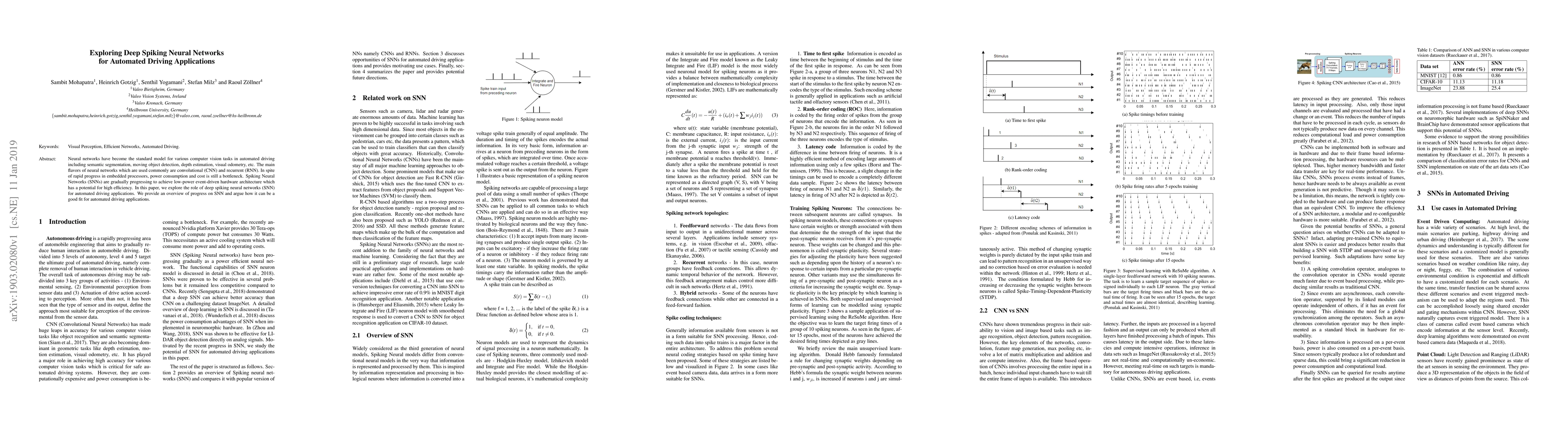 Neural networks have become the standard model for various computer vision tasks in automated driving including semantic segmentation, moving object detection, depth estimation, visual odometry, etc. The main flavors of neural networks which are used commonly are convolutional (CNN) and recurrent (RNN). In spite of rapid progress in embedded processors, power consumption and cost is still a bottleneck. Spiking Neural Networks (SNNs) are gradually progressing to achieve low-power event-driven hardware architecture which has a potential for high efficiency. In this paper, we explore the role of deep spiking neural networks (SNN) for automated driving applications. We provide an overview of progress on SNN and argue how it can be a good fit for automated driving applications.