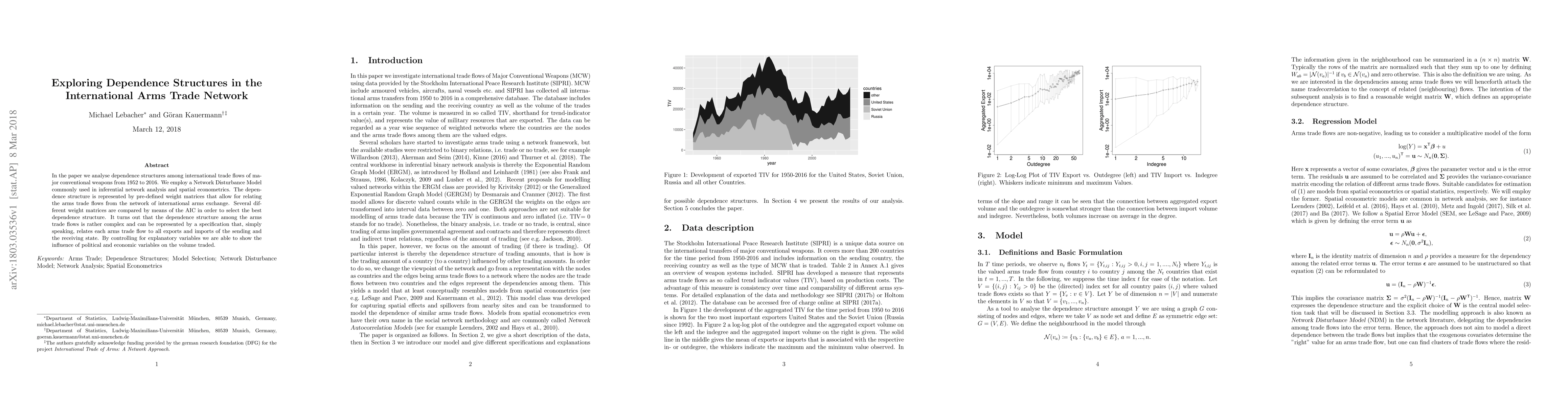 This paper analyzes the complex dependence structures in the international arms trade network from 1952 to 2016 using a Network Disturbance Model. The study identifies the best dependence structure through the AIC, revealing that arms trade flows are interrelated with both exports and imports of sending and receiving states, influenced by political and economic variables.