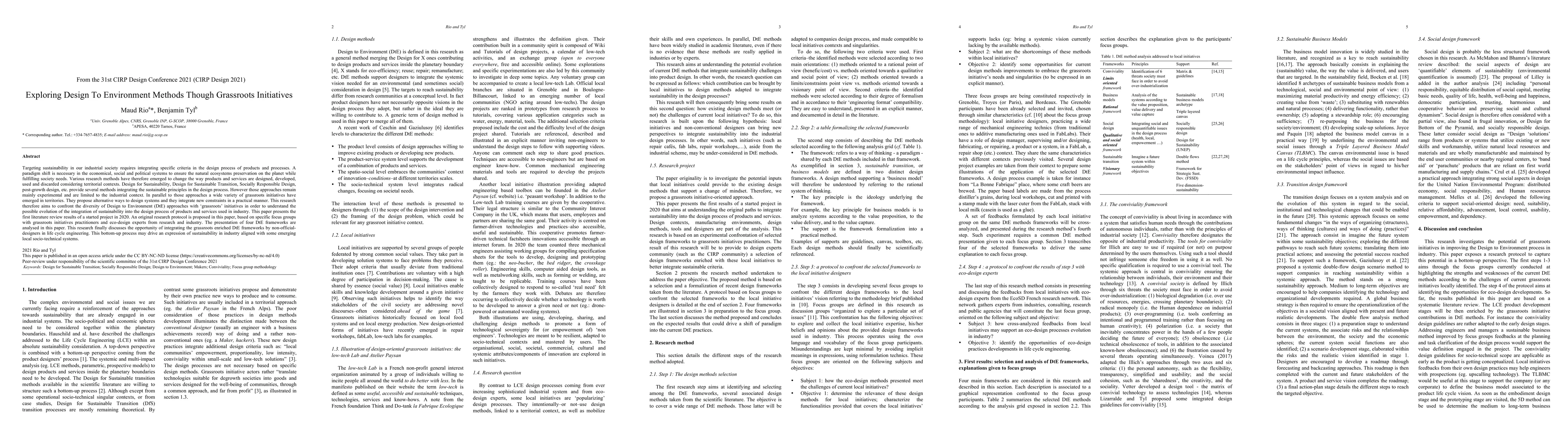 This research paper explores how grassroots initiatives can inform Design to Environment (DtE) approaches to design more sustainable products and services. It proposes a new framework for integrating sustainability into the design process through non-official designers in life cycle engineering.