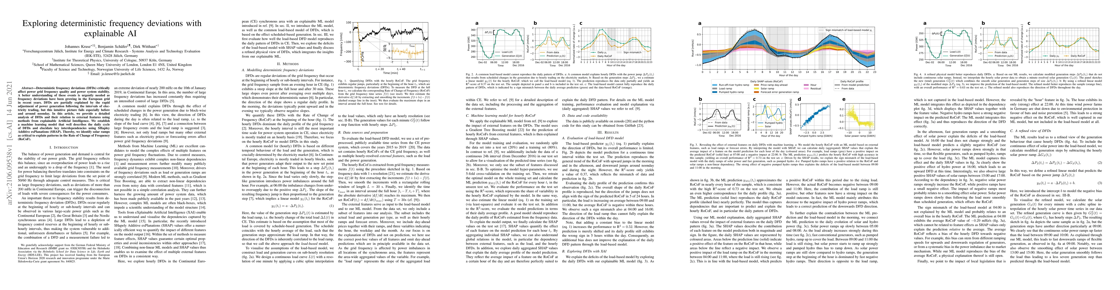 Deterministic frequency deviations (DFDs) critically affect power grid frequency quality and power system stability. A better understanding of these events is urgently needed as frequency deviations have been growing in the European grid in recent years. DFDs are partially explained by the rapid adjustment of power generation following the intervals of electricity trading, but this intuitive picture fails especially before and around noonday. In this article, we provide a detailed analysis of DFDs and their relation to external features using methods from explainable Artificial Intelligence. We establish a machine learning model that well describes the daily cycle of DFDs and elucidate key interdependencies using SHapley Additive exPlanations (SHAP). Thereby, we identify solar ramps as critical to explain patterns in the Rate of Change of Frequency (RoCoF).