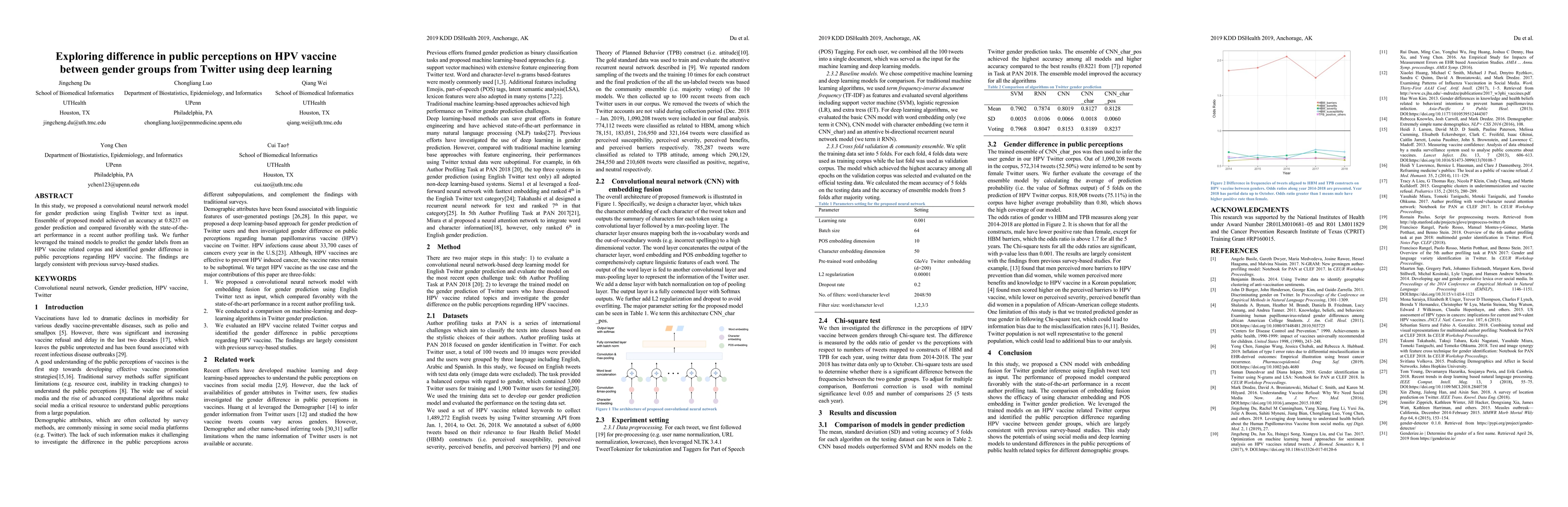 In this study, we proposed a convolutional neural network model for gender prediction using English Twitter text as input. Ensemble of proposed model achieved an accuracy at 0.8237 on gender prediction and compared favorably with the state-of-the-art performance in a recent author profiling task. We further leveraged the trained models to predict the gender labels from an HPV vaccine related corpus and identified gender difference in public perceptions regarding HPV vaccine. The findings are largely consistent with previous survey-based studies.