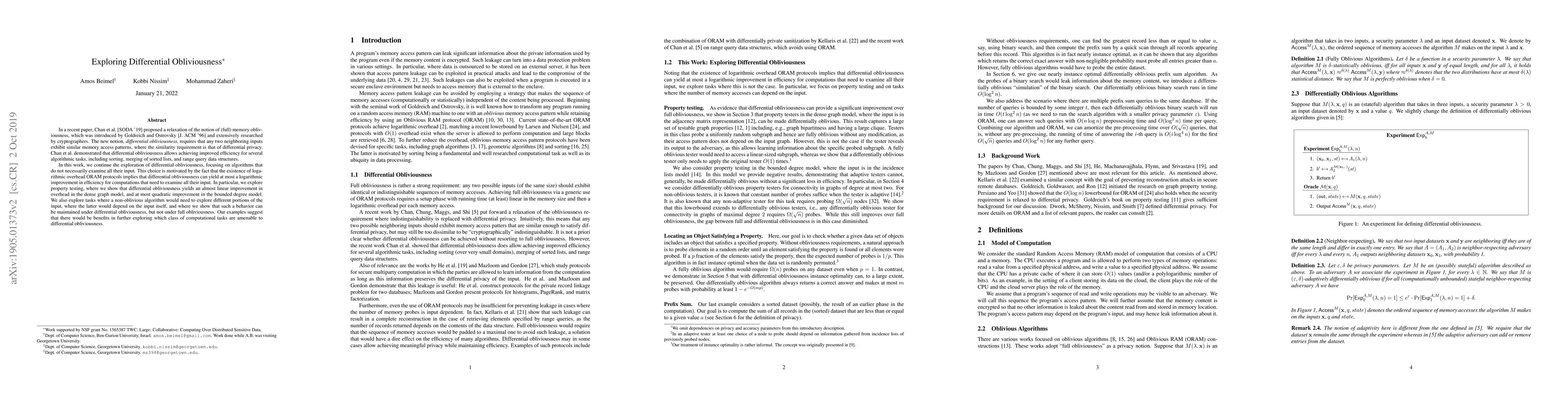 This paper extends the concept of differential obliviousness, introduced by Chan et al., to algorithms that do not examine all input data. It demonstrates significant efficiency improvements in property testing and tasks requiring selective input exploration under differential obliviousness, suggesting further research into its applicability.