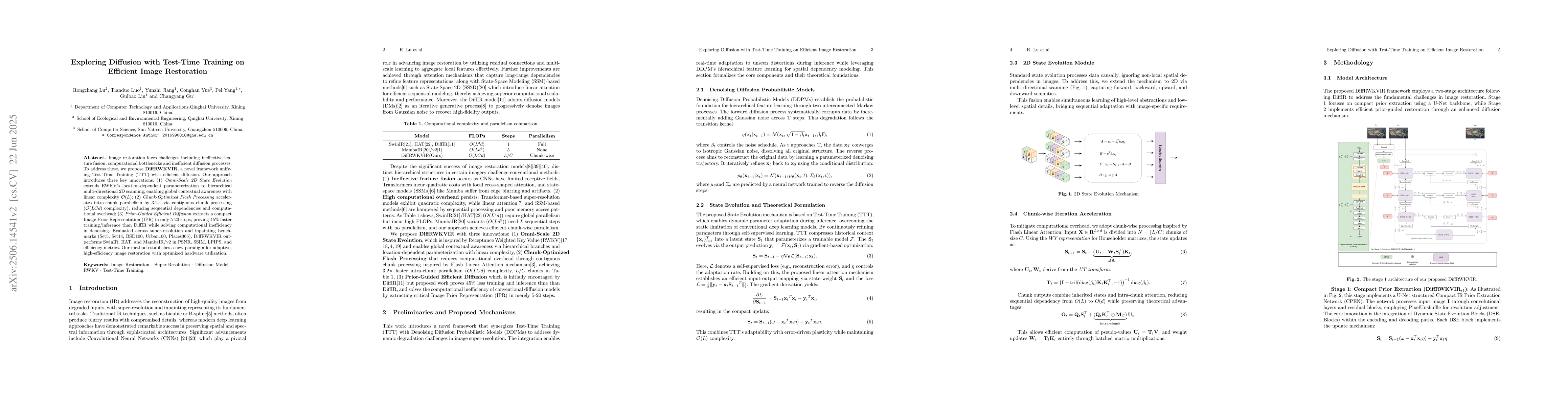 Image restoration faces challenges including ineffective feature fusion, computational bottlenecks and inefficient diffusion processes. To address these, we propose DiffRWKVIR, a novel framework unifying Test-Time Training (TTT) with efficient diffusion. Our approach introduces three key innovations: (1) Omni-Scale 2D State Evolution extends RWKV's location-dependent parameterization to hierarchical multi-directional 2D scanning, enabling global contextual awareness with linear complexity O(L); (2) Chunk-Optimized Flash Processing accelerates intra-chunk parallelism by 3.2x via contiguous chunk processing (O(LCd) complexity), reducing sequential dependencies and computational overhead; (3) Prior-Guided Efficient Diffusion extracts a compact Image Prior Representation (IPR) in only 5-20 steps, proving 45% faster training/inference than DiffIR while solving computational inefficiency in denoising. Evaluated across super-resolution and inpainting benchmarks (Set5, Set14, BSD100, Urban100, Places365), DiffRWKVIR outperforms SwinIR, HAT, and MambaIR/v2 in PSNR, SSIM, LPIPS, and efficiency metrics. Our method establishes a new paradigm for adaptive, high-efficiency image restoration with optimized hardware utilization.