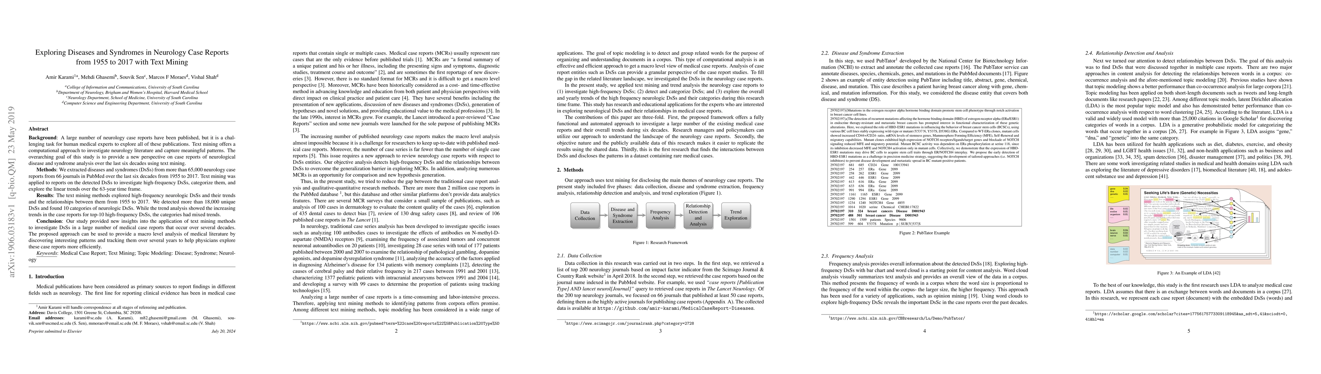 This study utilized text mining to analyze over 65,000 neurology case reports from 1955 to 2017, identifying more than 18,000 unique diseases and syndromes and categorizing them into 10 groups. The findings reveal trends in high-frequency neurological conditions and suggest text mining as a valuable tool for macro-level analysis of medical literature.