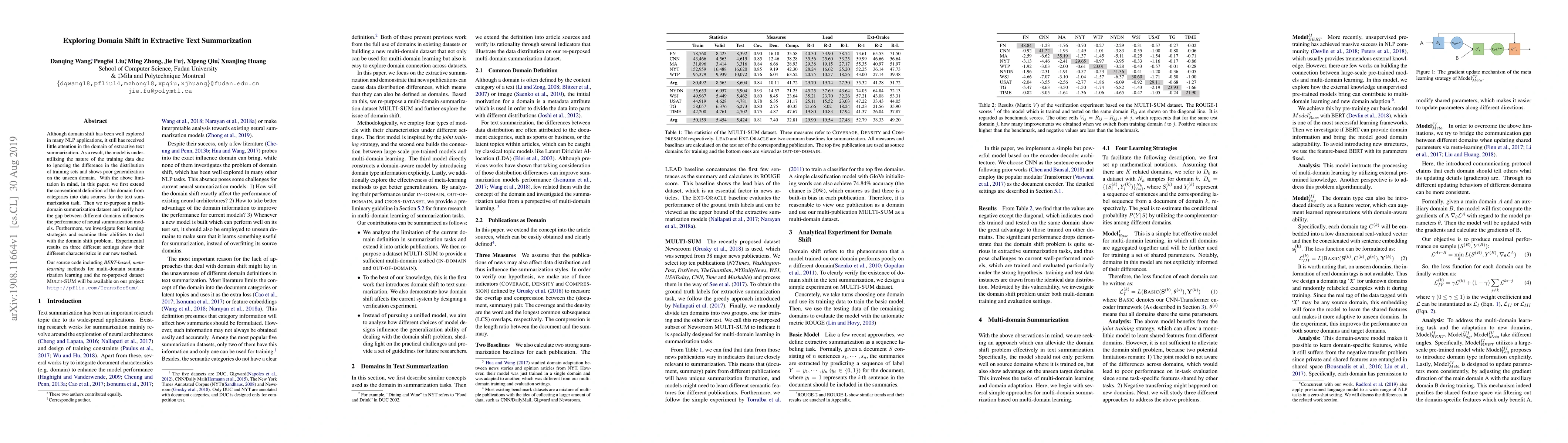 This paper investigates the impact of domain shift in extractive text summarization, extending the domain definition to data sources and evaluating the performance gap between different domains. It explores four learning strategies to address domain shift and provides a re-purposed dataset, \textsc{Multi-SUM}, along with source code for \textit{BERT-based} and \textit{meta-learning} methods.
