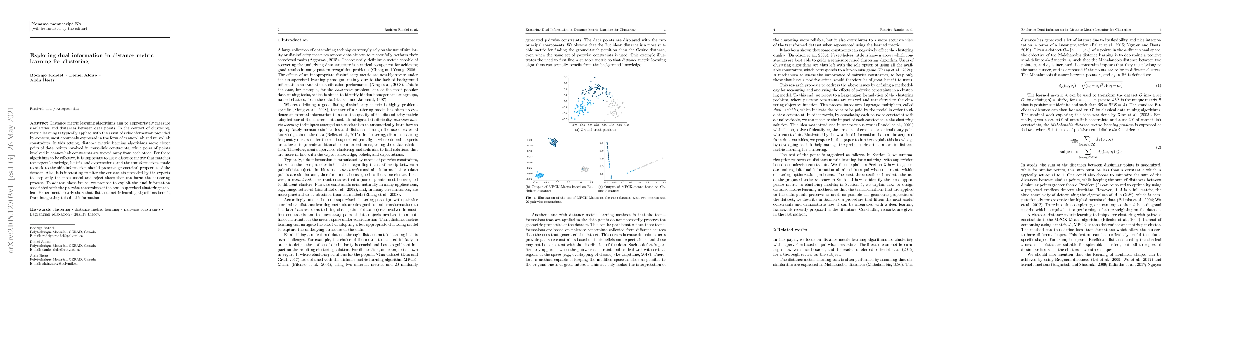 This paper proposes a method to enhance distance metric learning for clustering by incorporating dual information from pairwise constraints provided by experts. The approach aims to improve the effectiveness of clustering algorithms by filtering and utilizing the most useful constraints while preserving the dataset's geometrical properties.