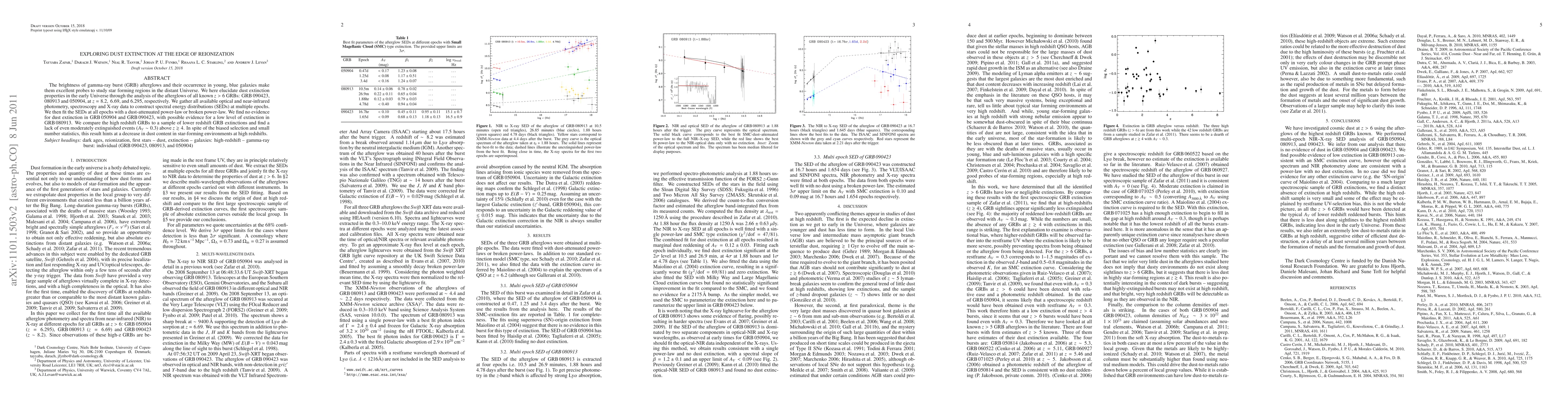 This study analyzes gamma-ray burst (GRB) afterglows at z > 6 to investigate dust extinction in the early Universe, finding no significant extinction in GRB 050904 and GRB 090423, and possible low-level extinction in GRB 080913. The results suggest a decrease in dust content in star-forming regions at high redshifts.