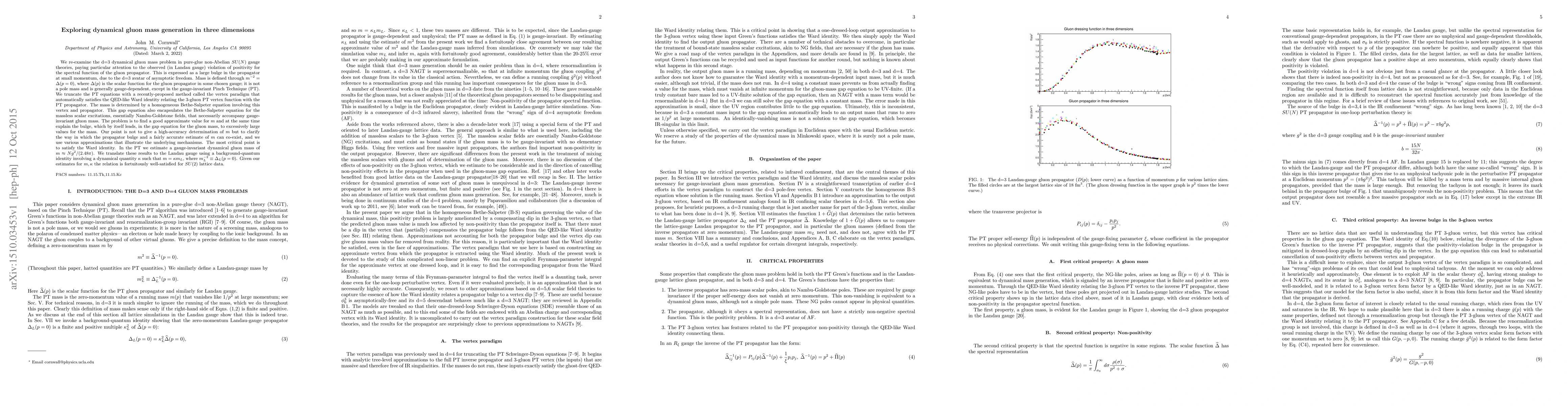 In the d=3 gluon mass problem in pure-glue non-Abelian $SU(N)$ gauge theory we pay particular attention to the observed (in Landau gauge) violation of positivity for the spectral function of the gluon propagator. This causes a large bulge in the propagator at small momentum. Mass is defined through $m^{-2}=\Delta (p=0)$, where $\Delta(p)$ is the scalar function for the gluon propagator in some chosen gauge, it is not a pole mass and is generally gauge-dependent, except in the gauge-invariant Pinch Technique (PT). We truncate the PT equations with a new method called the vertex paradigm that automatically satisfies the QED-like Ward identity relating the 3-gluon PT vertex function with the PT propagator. The mass is determined by a homogeneous Bethe-Salpeter equation involving this vertex and propagator. This gap equation also encapsulates the Bethe-Salpeter equation for the massless scalar excitations, essentially Nambu-Goldstone fields, that necessarily accompany gauge-invariant gluon mass. The problem is to find a good approximate value for $m$ and at the same time explain the bulge, which by itself leads, in the gap equation for the gluon mass, to excessively large values for the mass. Our point is not to give a high-accuracy determination of $m$ but to clarify the way in which the propagator bulge and a fairly accurate estimate of $m$ can co-exist, and we use various approximations that illustrate the underlying mechanisms. The most critical point is to satisfy the Ward identity. In the PT we estimate a gauge-invariant dynamical gluon mass of $m \approx Ng^2/(2.48 \pi)$. We translate these results to the Landau gauge using a background-quantum identity involving a dynamical quantity $\kappa$ such that $m=\kappa m_L$, where $m_L^{-2}\equiv \Delta_L(p=0)$. Given our estimates for $m,\kappa$ the relation is fortuitously well-satisfied for $SU(2)$ lattice data.