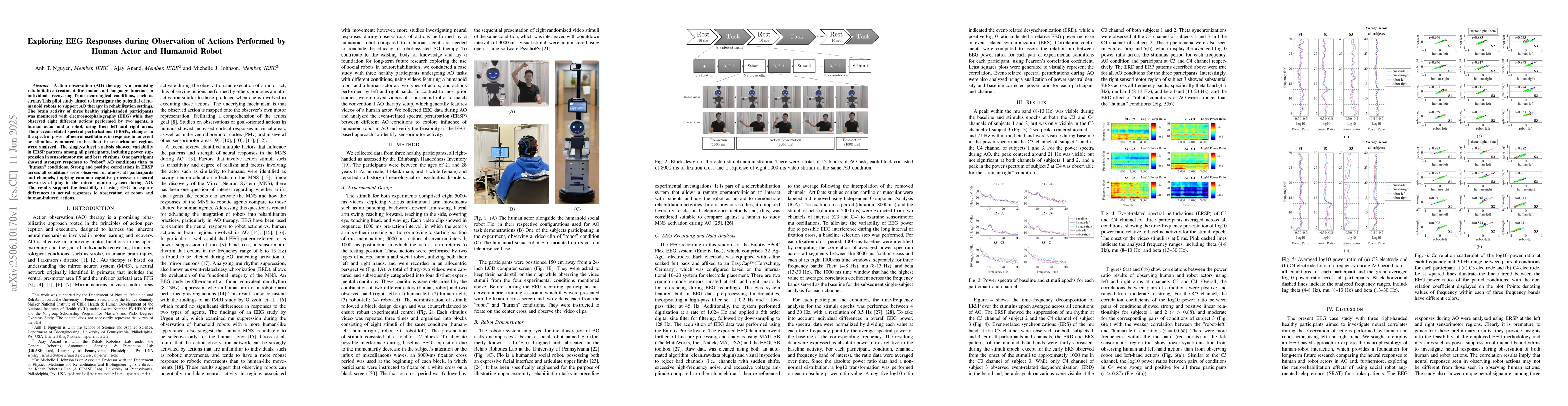 Action observation (AO) therapy is a promising rehabilitative treatment for motor and language function in individuals recovering from neurological conditions, such as stroke. This pilot study aimed to investigate the potential of humanoid robots to support AO therapy in rehabilitation settings. The brain activity of three healthy right-handed participants was monitored with electroencephalography (EEG) while they observed eight different actions performed by two agents, a human actor and a robot, using their left and right arms. Their event-related spectral perturbations (ERSPs, changes in the spectral power of neural oscillations in response to an event or stimulus, compared to baseline) in sensorimotor regions were analyzed. The single-subject analysis showed variability in ERSP patterns among all participants, including power suppression in sensorimotor mu and beta rhythms. One participant showed stronger responses to "robot" AO conditions than to "human" conditions. Strong and positive correlations in ERSP across all conditions were observed for almost all participants and channels, implying common cognitive processes or neural networks at play in the mirror neuron system during AO. The results support the feasibility of using EEG to explore differences in neural responses to observation of robot- and human-induced actions.