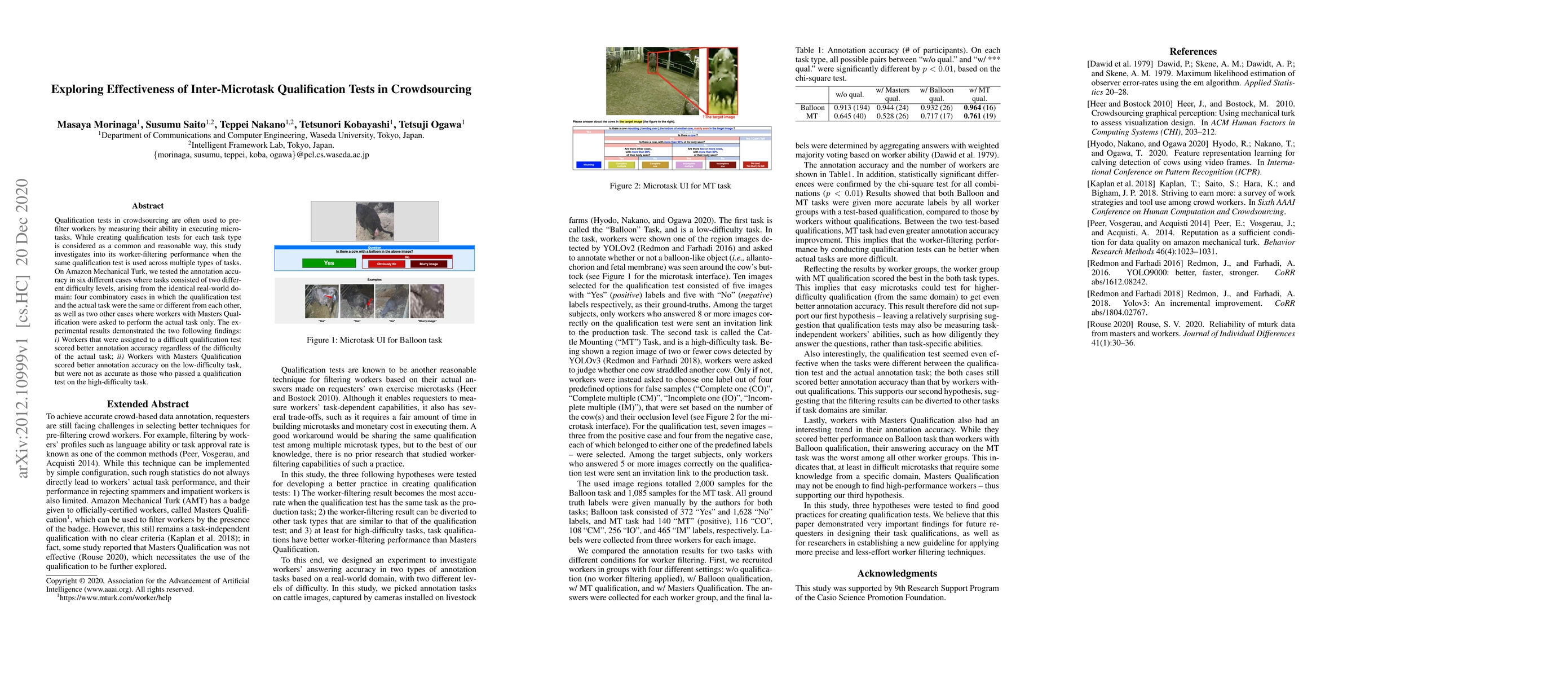 Qualification tests in crowdsourcing are often used to pre-filter workers by measuring their ability in executing microtasks.While creating qualification tests for each task type is considered as a common and reasonable way, this study investigates into its worker-filtering performance when the same qualification test is used across multiple types of tasks.On Amazon Mechanical Turk, we tested the annotation accuracy in six different cases where tasks consisted of two different difficulty levels, arising from the identical real-world domain: four combinatory cases in which the qualification test and the actual task were the same or different from each other, as well as two other cases where workers with Masters Qualification were asked to perform the actual task only.The experimental results demonstrated the two following findings: i) Workers that were assigned to a difficult qualification test scored better annotation accuracy regardless of the difficulty of the actual task; ii) Workers with Masters Qualification scored better annotation accuracy on the low-difficulty task, but were not as accurate as those who passed a qualification test on the high-difficulty task.