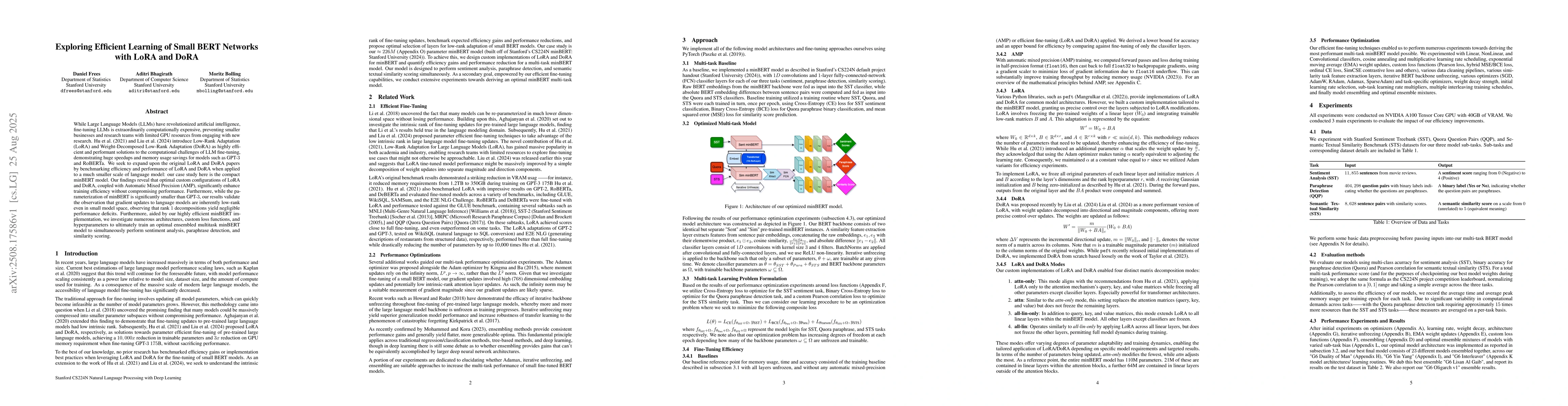 While Large Language Models (LLMs) have revolutionized artificial intelligence, fine-tuning LLMs is extraordinarily computationally expensive, preventing smaller businesses and research teams with limited GPU resources from engaging with new research. Hu et al and Liu et al introduce Low-Rank Adaptation (LoRA) and Weight-Decomposed Low-Rank Adaptation (DoRA) as highly efficient and performant solutions to the computational challenges of LLM fine-tuning, demonstrating huge speedups and memory usage savings for models such as GPT-3 and RoBERTa. We seek to expand upon the original LoRA and DoRA papers by benchmarking efficiency and performance of LoRA and DoRA when applied to a much smaller scale of language model: our case study here is the compact minBERT model. Our findings reveal that optimal custom configurations of LoRA and DoRA, coupled with Automatic Mixed Precision (AMP), significantly enhance training efficiency without compromising performance. Furthermore, while the parameterization of minBERT is significantly smaller than GPT-3, our results validate the observation that gradient updates to language models are inherently low-rank even in small model space, observing that rank 1 decompositions yield negligible performance deficits. Furthermore, aided by our highly efficient minBERT implementation, we investigate numerous architectures, custom loss functions, and hyperparameters to ultimately train an optimal ensembled multitask minBERT model to simultaneously perform sentiment analysis, paraphrase detection, and similarity scoring.