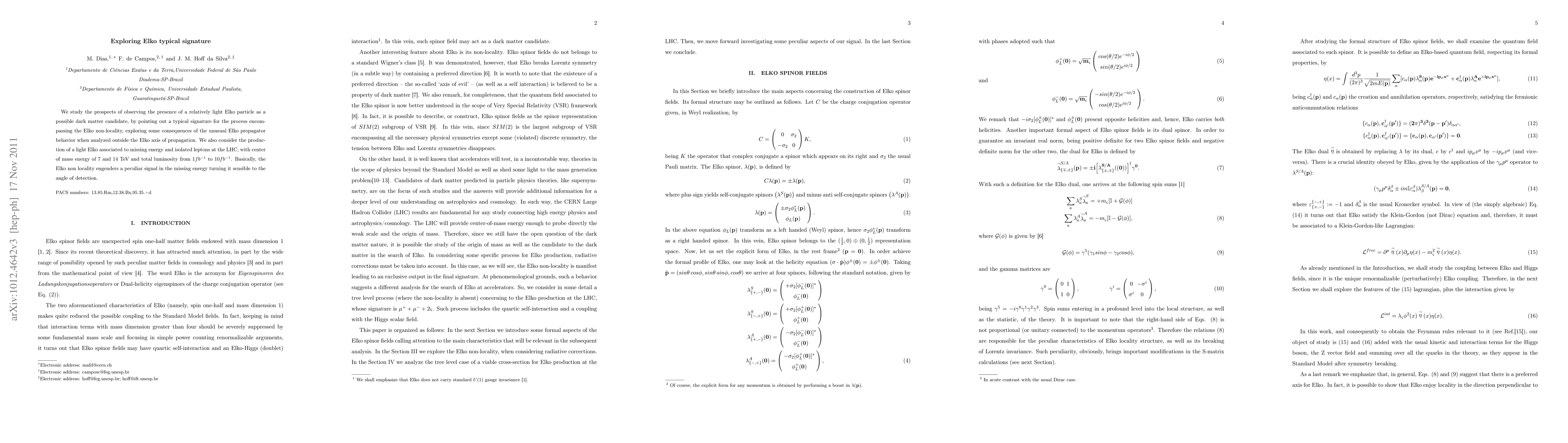 This paper investigates the potential detection of a light Elko particle as a dark matter candidate, highlighting its unique signature due to Elko non-locality. The study explores the Elko propagator's behavior and its implications for missing energy and isolated leptons at the LHC, suggesting a detectable angle-dependent signal.