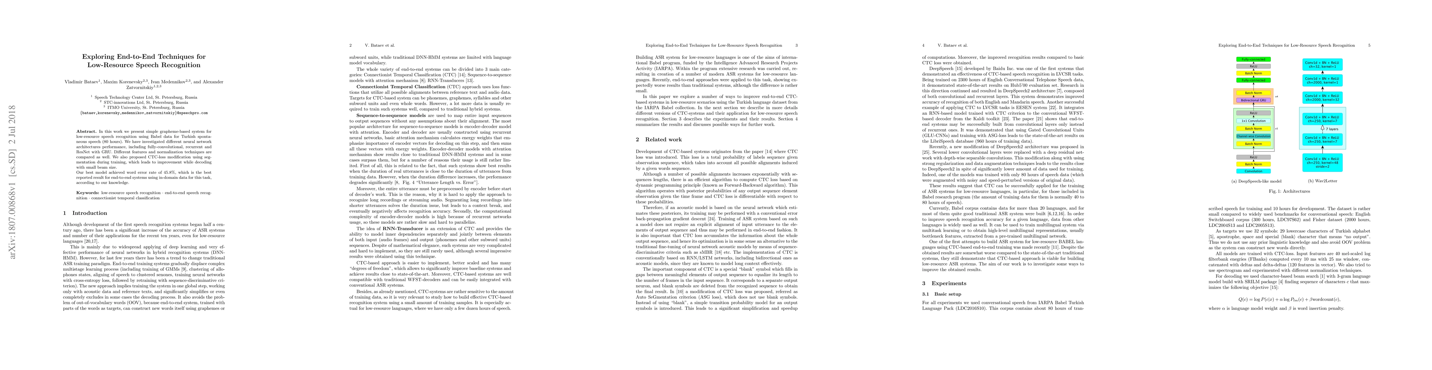 In this work we present simple grapheme-based system for low-resource speech recognition using Babel data for Turkish spontaneous speech (80 hours). We have investigated different neural network architectures performance, including fully-convolutional, recurrent and ResNet with GRU. Different features and normalization techniques are compared as well. We also proposed CTC-loss modification using segmentation during training, which leads to improvement while decoding with small beam size. Our best model achieved word error rate of 45.8%, which is the best reported result for end-to-end systems using in-domain data for this task, according to our knowledge.