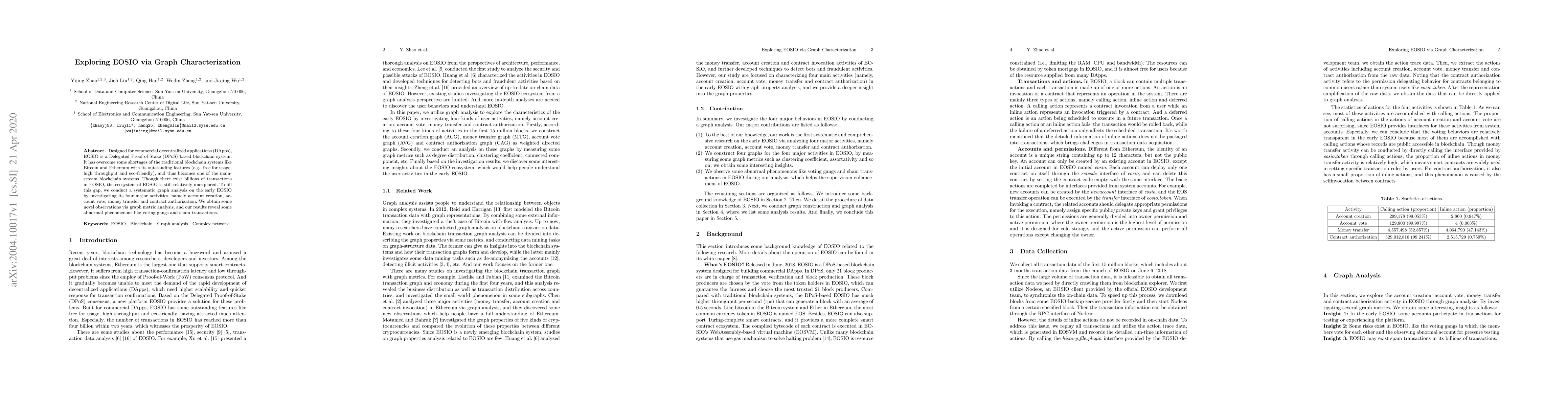 This paper conducts a systematic graph characterization of the EOSIO blockchain, focusing on four main activities: account creation, account vote, money transfer, and contract authorization. The study reveals novel insights and identifies abnormal phenomena such as voting gangs and sham transactions, contributing to a deeper understanding of EOSIO's ecosystem.