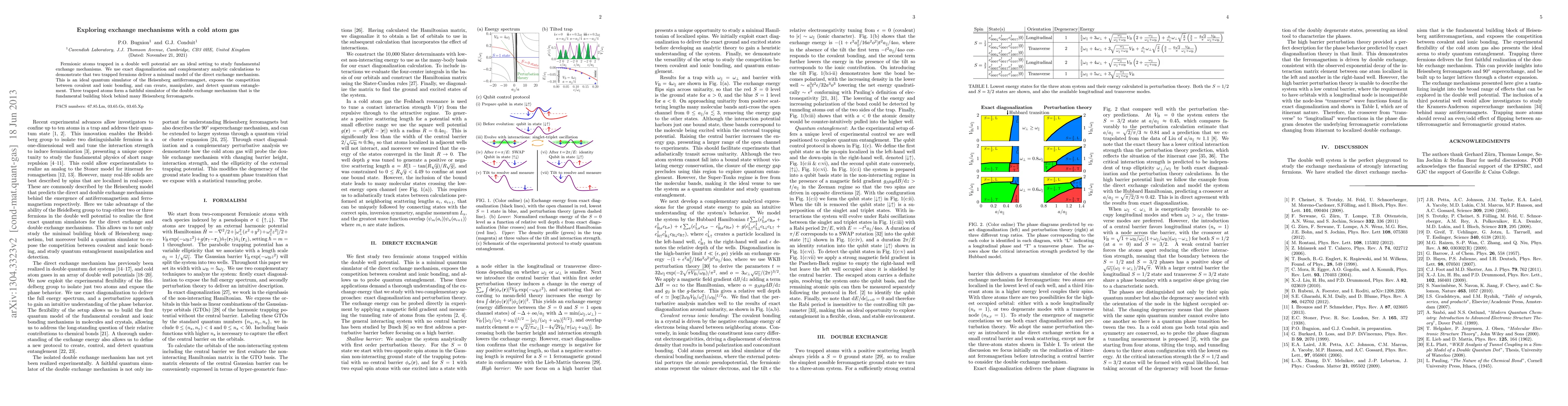 Fermionic atoms trapped in a double well potential are an ideal setting to study fundamental exchange mechanisms. We use exact diagonalization and complementary analytic calculations to demonstrate that two trapped fermions deliver a minimal model of the direct exchange mechanism. This is an ideal quantum simulator of the Heisenberg antiferromagnet, exposes the competition between covalent and ionic bonding, and can create, manipulate, and detect quantum entanglement. Three trapped atoms form a faithful simulator of the double exchange mechanism that is the fundamental building block behind many Heisenberg ferromagnets.