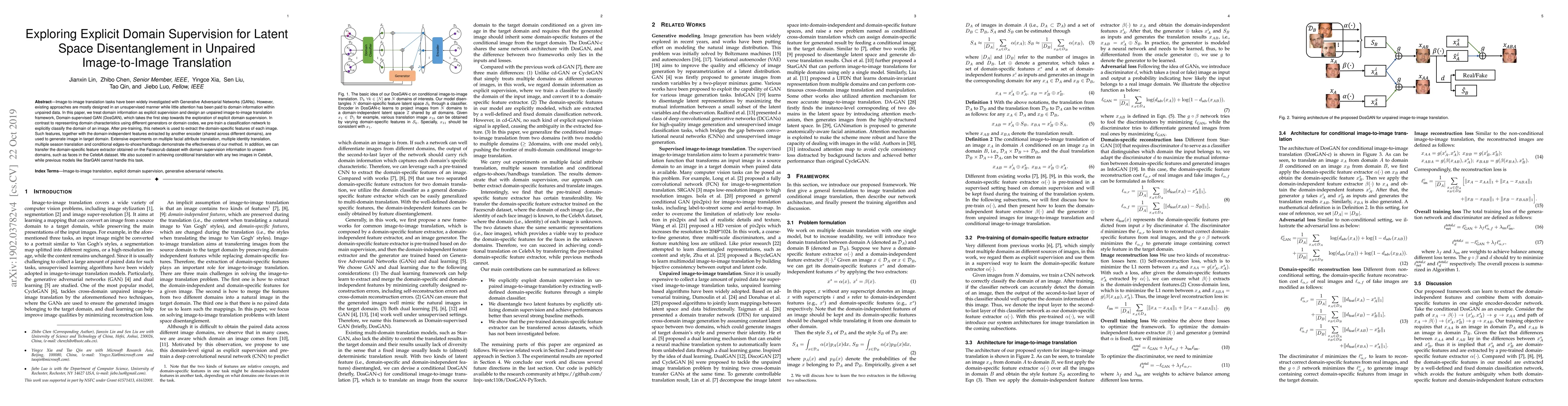 This paper introduces a novel unpaired image-to-image translation framework, DosGAN, which leverages explicit domain supervision to disentangle latent representations. The method uses a pre-trained classification network to extract domain-specific features, enhancing translation accuracy across various tasks.