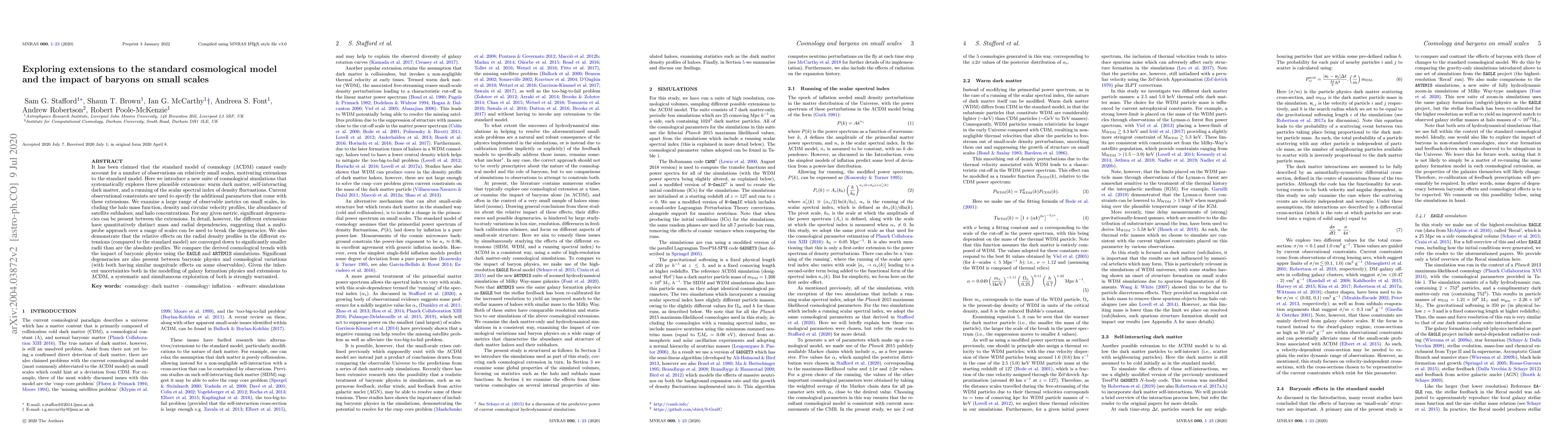 It has been claimed that the standard model of cosmology (LCDM) cannot easily account for a number of observations on relatively small scales, motivating extensions to the standard model. Here we introduce a new suite of cosmological simulations that systematically explores three plausible extensions: warm dark matter, self-interacting dark matter, and a running of the scalar spectral index of density fluctuations. Current observational constraints are used to specify the additional parameters that come with these extensions. We examine a large range of observable metrics on small scales, including the halo mass function, density and circular velocity profiles, the abundance of satellite subhaloes, and halo concentrations. For any given metric, significant degeneracies can be present between the extensions. In detail, however, the different extensions have quantitatively distinct mass and radial dependencies, suggesting that a multi-probe approach over a range of scales can be used to break the degeneracies. We also demonstrate that the relative effects on the radial density profiles in the different extensions (compared to the standard model) are converged down to significantly smaller radii than are the absolute profiles. We compare the derived cosmological trends with the impact of baryonic physics using the EAGLE and ARTEMIS simulations. Significant degeneracies are also present between baryonic physics and cosmological variations (with both having similar magnitude effects on some observables). Given the inherent uncertainties both in the modelling of galaxy formation physics and extensions to LCDM, a systematic and simultaneous exploration of both is strongly warranted.
