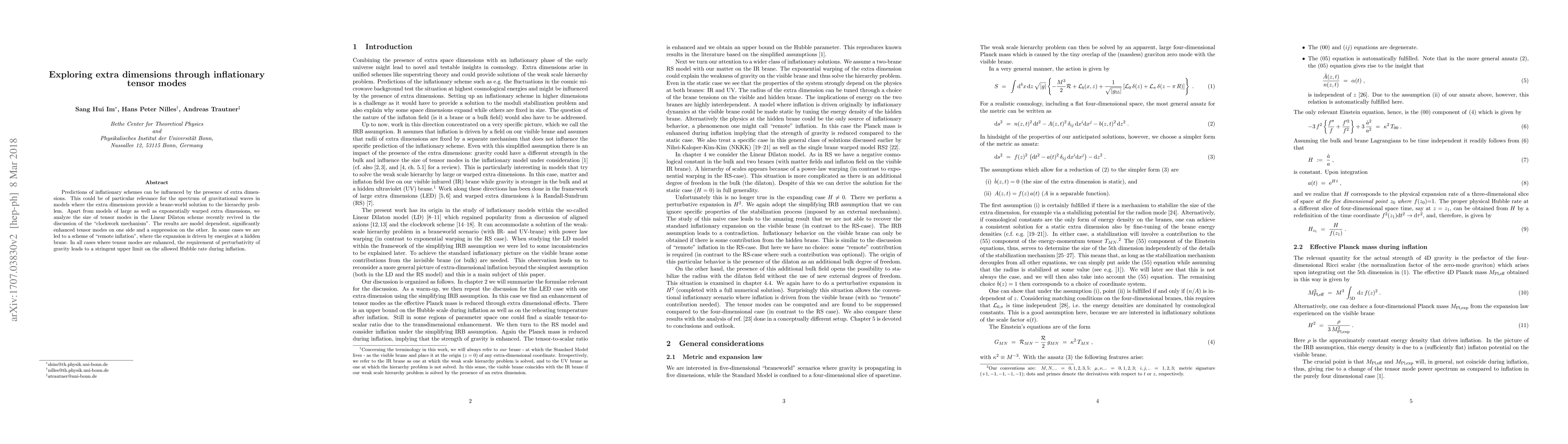 This paper explores how extra dimensions affect inflationary tensor modes, particularly in the Linear Dilaton scheme, revealing model-dependent outcomes ranging from enhanced tensor modes to suppression. It also introduces the concept of "remote inflation" driven by hidden brane energies, with perturbativity of gravity imposing a strict upper limit on the Hubble rate during inflation.