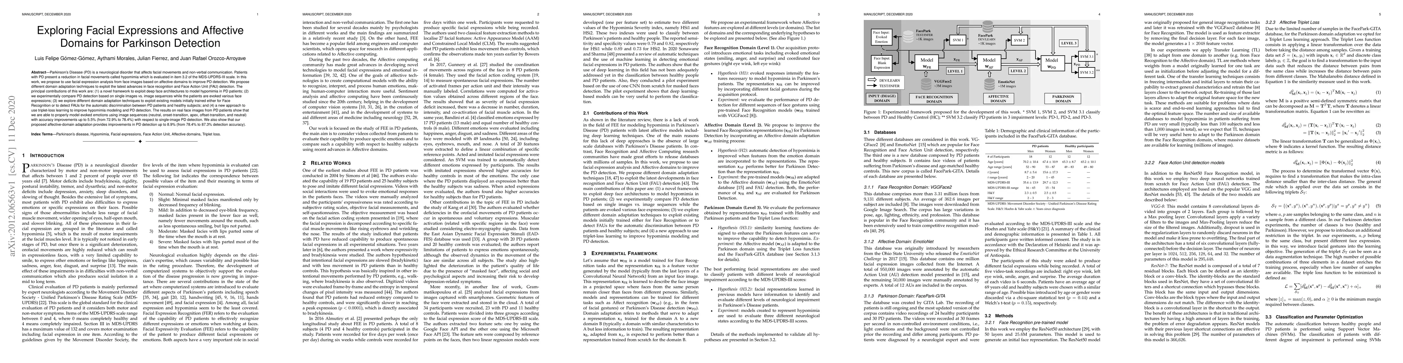 Parkinson's Disease (PD) is a neurological disorder that affects facial movements and non-verbal communication. Patients with PD present a reduction in facial movements called hypomimia which is evaluated in item 3.2 of the MDS-UPDRS-III scale. In this work, we propose to use facial expression analysis from face images based on affective domains to improve PD detection. We propose different domain adaptation techniques to exploit the latest advances in face recognition and Face Action Unit (FAU) detection. The principal contributions of this work are: (1) a novel framework to exploit deep face architectures to model hypomimia in PD patients; (2) we experimentally compare PD detection based on single images vs. image sequences while the patients are evoked various face expressions; (3) we explore different domain adaptation techniques to exploit existing models initially trained either for Face Recognition or to detect FAUs for the automatic discrimination between PD patients and healthy subjects; and (4) a new approach to use triplet-loss learning to improve hypomimia modeling and PD detection. The results on real face images from PD patients show that we are able to properly model evoked emotions using image sequences (neutral, onset-transition, apex, offset-transition, and neutral) with accuracy improvements up to 5.5% (from 72.9% to 78.4%) with respect to single-image PD detection. We also show that our proposed affective-domain adaptation provides improvements in PD detection up to 8.9% (from 78.4% to 87.3% detection accuracy).
