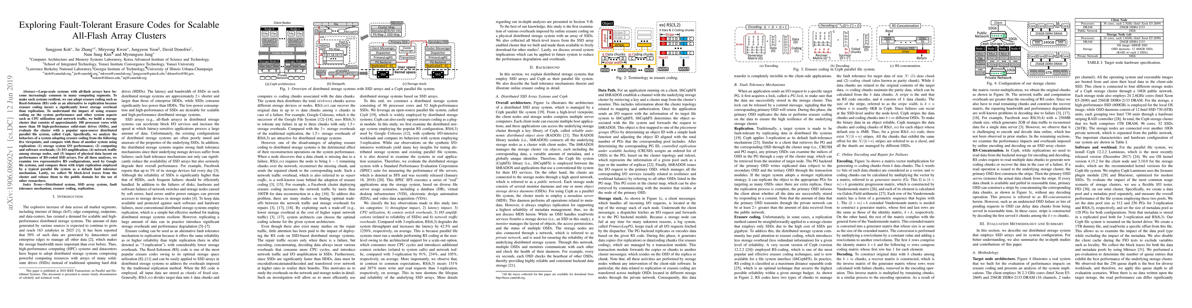 This paper explores the use of fault-tolerant erasure codes, specifically Reed-Solomon (RS) codes, in large-scale all-flash storage arrays to reduce storage overhead compared to replication. It evaluates a cluster with 100 processor cores and 50 SSDs using Ceph, analyzing performance, CPU utilization, network traffic, and data layout impacts, comparing RS codes to triple replication.