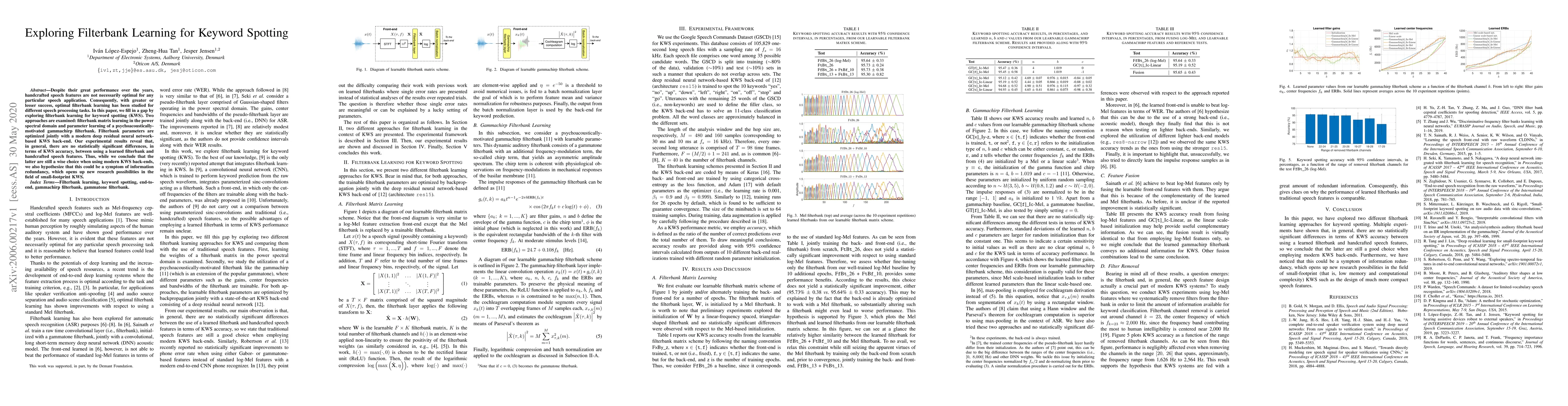 This paper investigates filterbank learning for keyword spotting, comparing two approaches: filterbank matrix learning and a psychoacoustically-motivated gammachirp filterbank. Results show no significant accuracy differences compared to handcrafted features, but suggest potential for reducing information redundancy in small-footprint KWS.