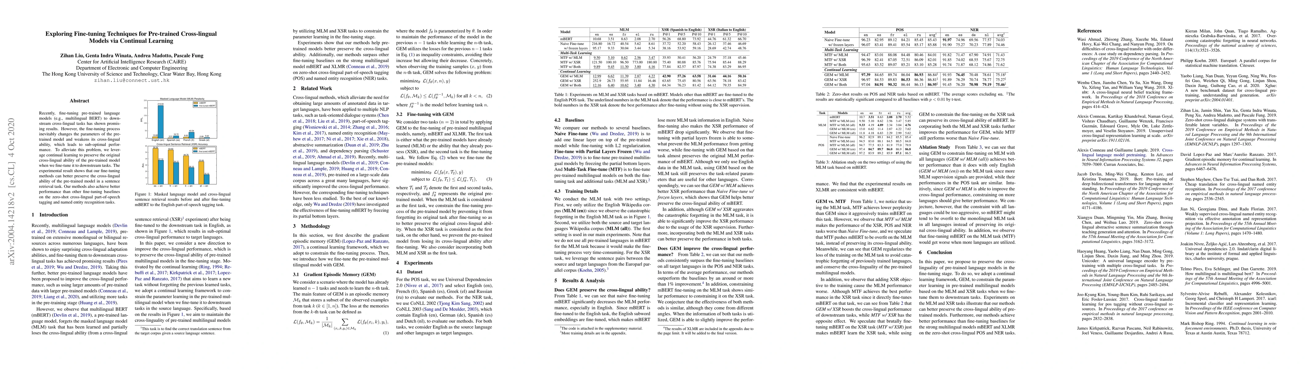This paper explores fine-tuning techniques for pre-trained cross-lingual models using continual learning to preserve their original cross-lingual abilities. Experimental results show improved performance in sentence retrieval, zero-shot cross-lingual part-of-speech tagging, and named entity recognition tasks.