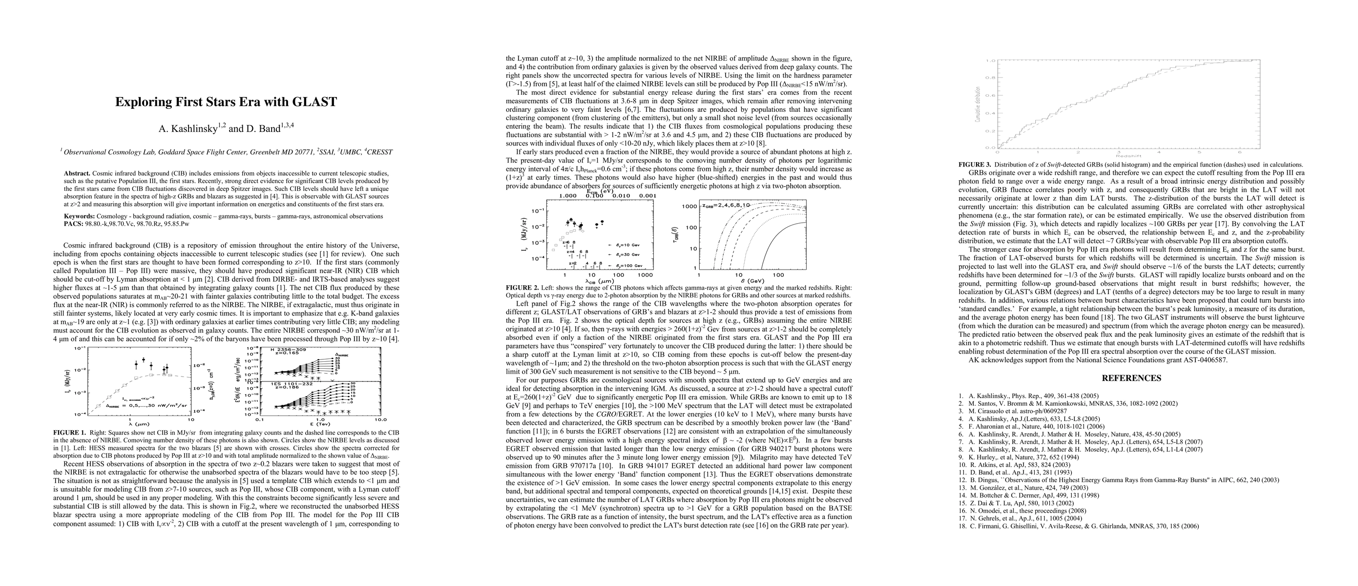 Cosmic infrared background (CIB) includes emissions from objects inaccessible to current telescopic studies, such as the putative Population III, the first stars. Recently, strong direct evidence for significant CIB levels produced by the first stars came from CIB fluctuations discovered in deep Spitzer images. Such CIB levels should have left a unique absorption feature in the spectra of high-z GRBs and blazars as suggested in [4]. This is observable with GLAST sources at z>2 and measuring this absorption will give important information on energetics and constituents of the first stars era.