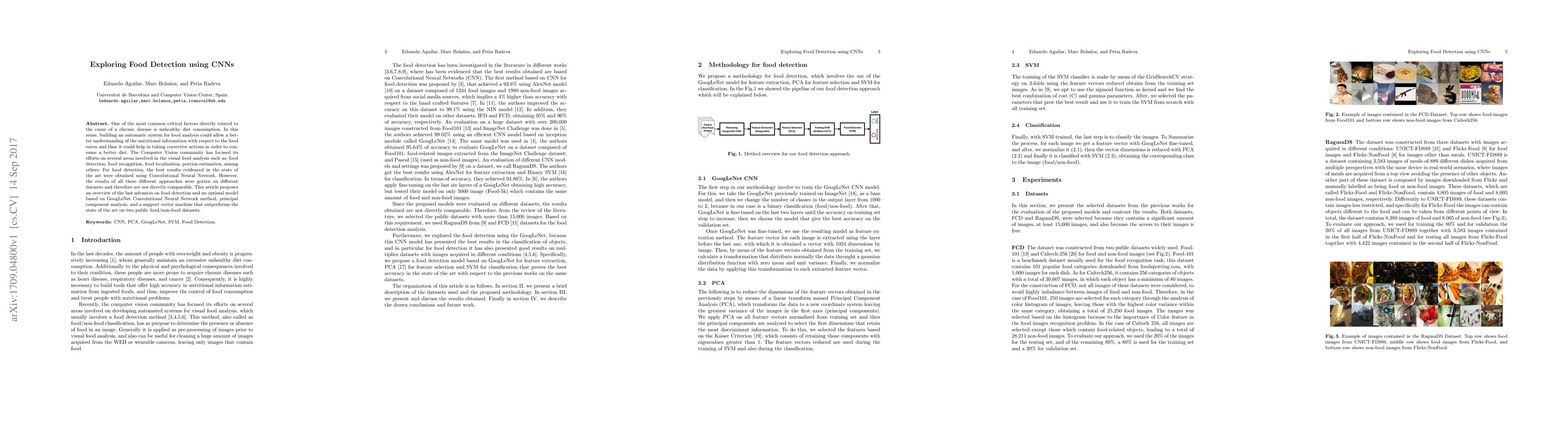 One of the most common critical factors directly related to the cause of a chronic disease is unhealthy diet consumption. In this sense, building an automatic system for food analysis could allow a better understanding of the nutritional information with respect to the food eaten and thus it could help in taking corrective actions in order to consume a better diet. The Computer Vision community has focused its efforts on several areas involved in the visual food analysis such as: food detection, food recognition, food localization, portion estimation, among others. For food detection, the best results evidenced in the state of the art were obtained using Convolutional Neural Network. However, the results of all these different approaches were gotten on different datasets and therefore are not directly comparable. This article proposes an overview of the last advances on food detection and an optimal model based on GoogLeNet Convolutional Neural Network method, principal component analysis, and a support vector machine that outperforms the state of the art on two public food/non-food datasets.