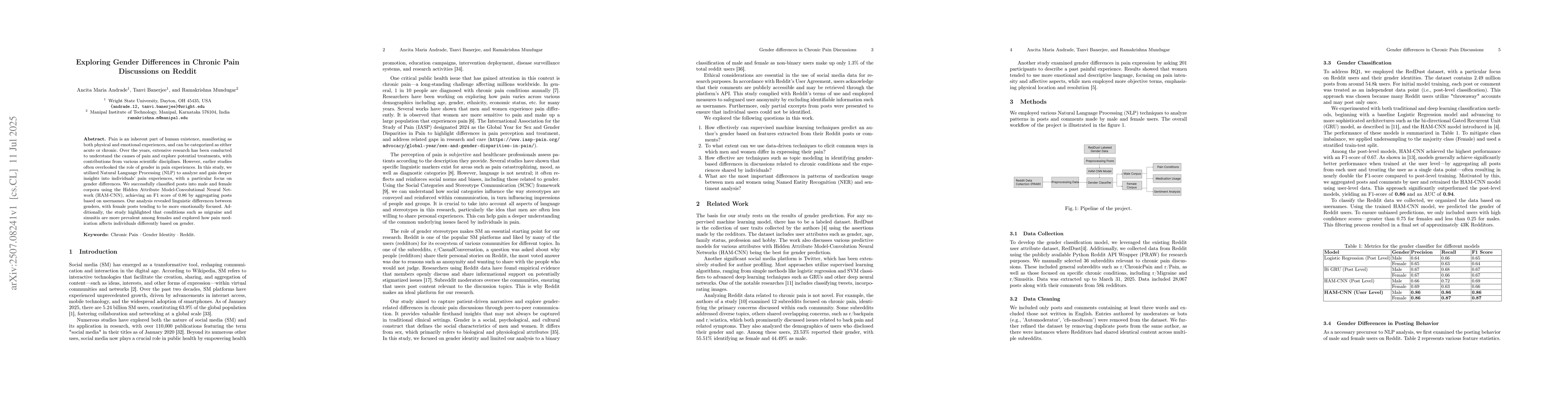 Pain is an inherent part of human existence, manifesting as both physical and emotional experiences, and can be categorized as either acute or chronic. Over the years, extensive research has been conducted to understand the causes of pain and explore potential treatments, with contributions from various scientific disciplines. However, earlier studies often overlooked the role of gender in pain experiences. In this study, we utilized Natural Language Processing (NLP) to analyze and gain deeper insights into individuals' pain experiences, with a particular focus on gender differences. We successfully classified posts into male and female corpora using the Hidden Attribute Model-Convolutional Neural Network (HAM-CNN), achieving an F1 score of 0.86 by aggregating posts based on usernames. Our analysis revealed linguistic differences between genders, with female posts tending to be more emotionally focused. Additionally, the study highlighted that conditions such as migraine and sinusitis are more prevalent among females and explored how pain medication affects individuals differently based on gender.