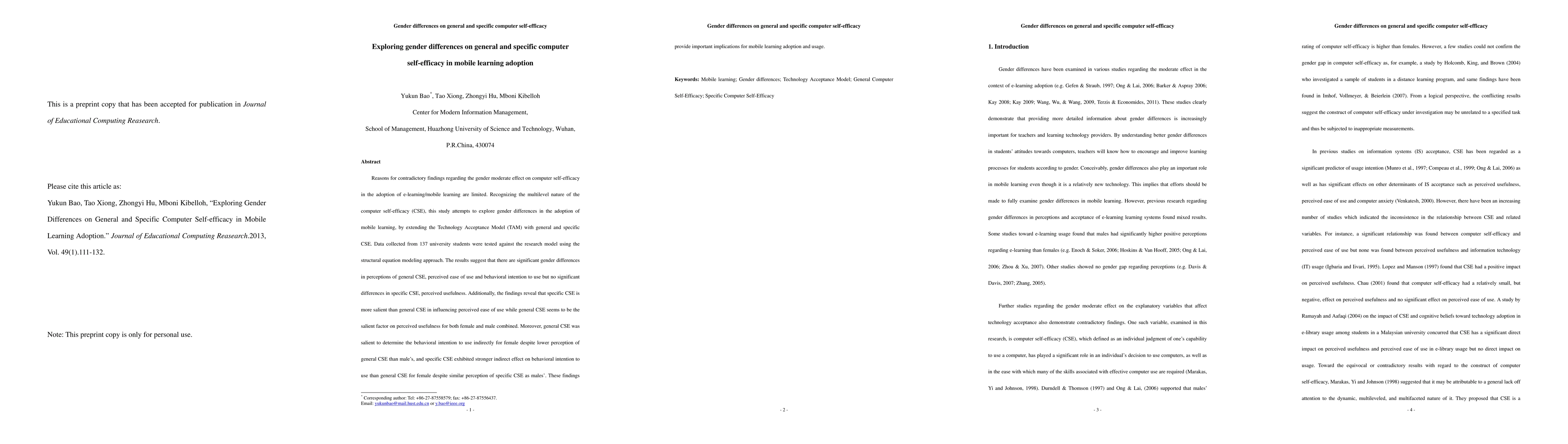 Reasons for contradictory findings regarding the gender moderate effect on computer self-efficacy in the adoption of e-learning/mobile learning are limited. Recognizing the multilevel nature of the computer self-efficacy (CSE), this study attempts to explore gender differences in the adoption of mobile learning, by extending the Technology Acceptance Model (TAM) with general and specific CSE. Data collected from 137 university students were tested against the research model using the structural equation modeling approach. The results suggest that there are significant gender differences in perceptions of general CSE, perceived ease of use and behavioral intention to use but no significant differences in specific CSE, perceived usefulness. Additionally, the findings reveal that specific CSE is more salient than general CSE in influencing perceived ease of use while general CSE seems to be the salient factor on perceived usefulness for both female and male combined. Moreover, general CSE was salient to determine the behavioral intention to use indirectly for female despite lower perception of general CSE than male's, and specific CSE exhibited stronger indirect effect on behavioral intention to use than general CSE for female despite similar perception of specific CSE as males'. These findings provide important implications for mobile learning adoption and usage.